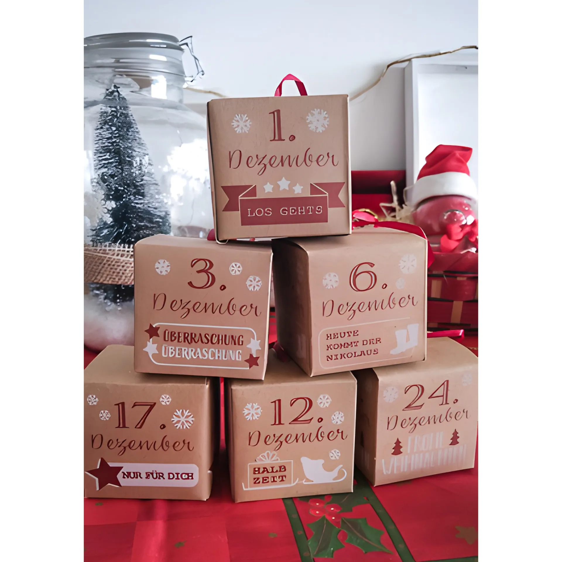 Mit diesen dekorativen Boxen aus festlich bedrucktem Kraftpapier können Sie im Handumdrehen einen tollen Adventskalender für Ihre Lieben basteln. Die quadratischen Kartons sind mit Adventskalender-Zahlen, Schneeflocken, verschiedenen Sprüchen und Motiven versehen und lassen sich leicht zusammenfalten. 6 Zahlenschachteln sind schon fertig gefaltet und mit einer roten Schlaufe versehen, bei den restlichen ist Ihre Fingerfertigkeit gefragt. Die einzelnen Boxen können mit kleinen Geschenken oder Aufmerksamkeiten befüllt werden und erfreuen den Beschenkten in der Vorweihnachtszeit jeden Tag aufs Neue.