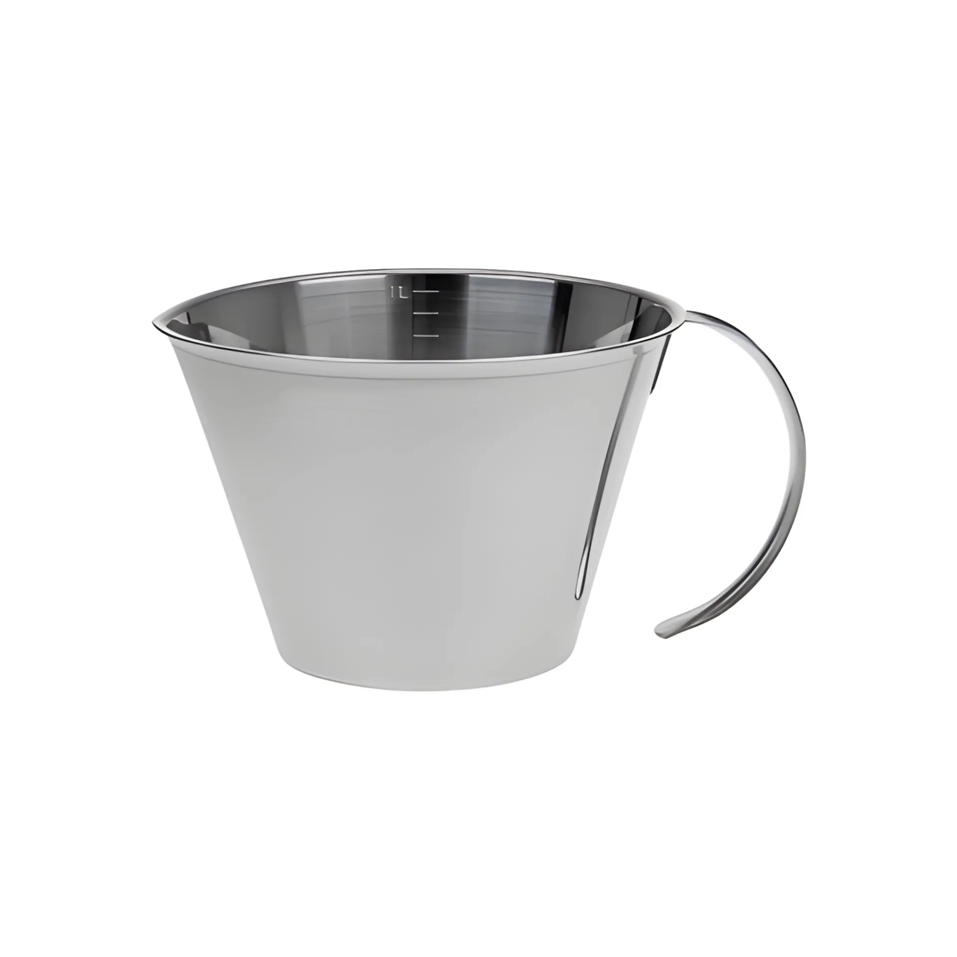 Robuster Messbecher aus Edelstahl, mit einem Fassungsvermögen von 1 Liter. Der leicht konische Behälter hat einen nach außen gewölbten Rand mit angedeuteten Gießschnabel und offenen Griff. Er ist gut stapelbar und kann platzsparend nach Gebrauch verstaut werden. Im Innenraum befindet sich die Skalierung in 100 ml Markierungen sowie eine Skala für die Maßeinheit Cup in 0,5 Cup Schritten zum perfekten und genauen Abmessen und Dosieren von Flüssigkeiten, Mehl oder Zucker. Das Gefäß besteht aus Edelstahl 18/10 und ist spülmaschinenfest.