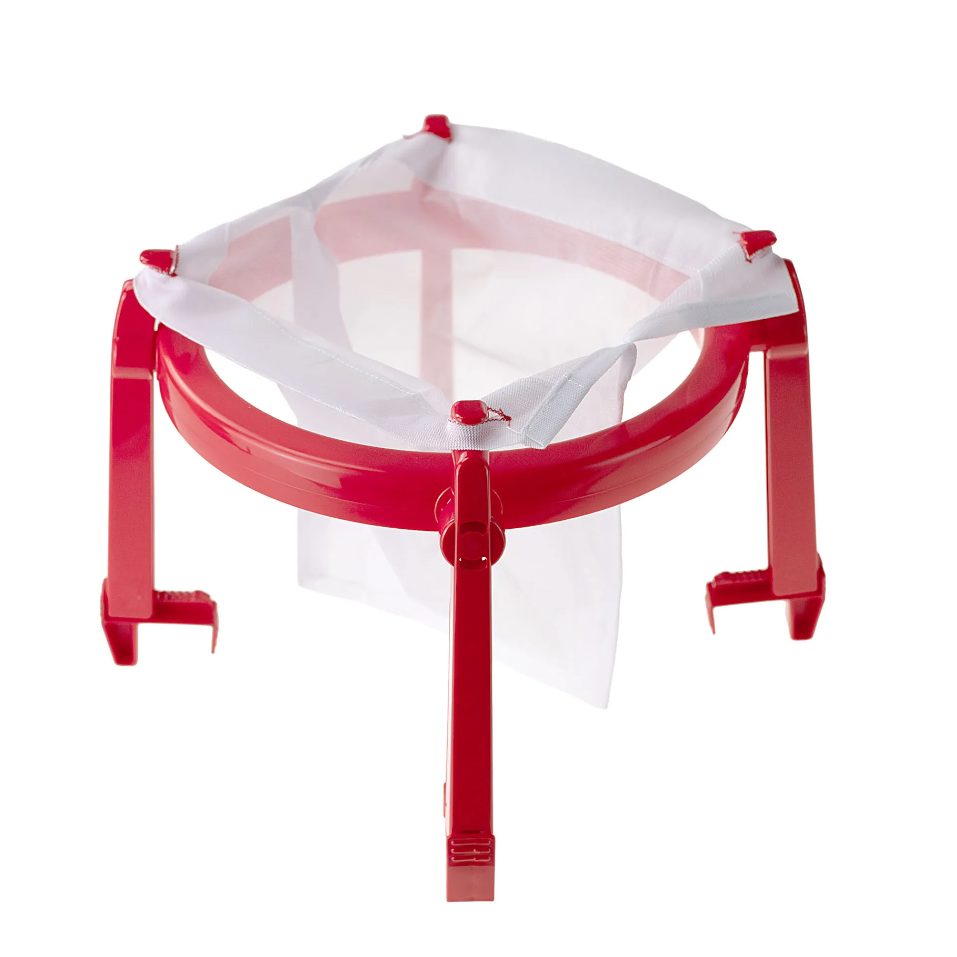 Die Halterung wird auf eine Schüssel gesetzt, die vorbereiteten Früchte werden in das Tuch gefüllt und lassen über Nacht den klaren Saft in die Schüssel tropfen. Wunderbar zur Geleeherstellung.