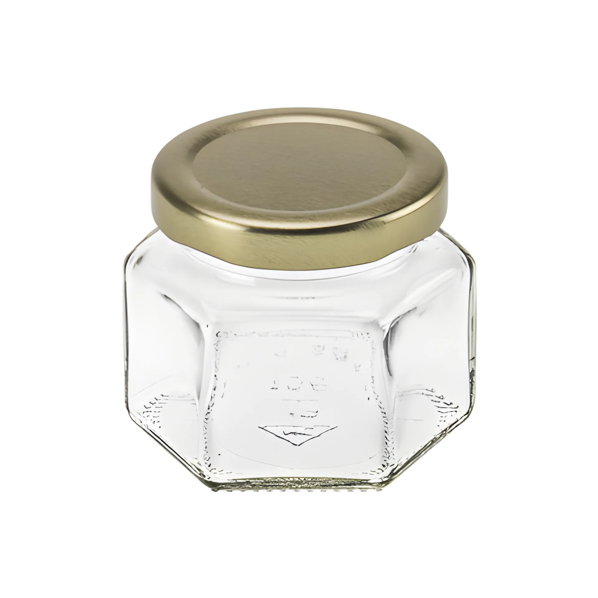 Sechskantglas in flacher Form mit 100 ml Nennvolumen, das als Einmachglas für Senf, Chutney und Konfitüre einiges her macht. Das formschöne Marmeladenglas kann natürlich auch sehr gut für Honig verwendet werden. Die sechseckige Schmuckform ist äußerst ansprechend und dekorativ, deshalb ist dieses ausgefallene Gläschen gerade für Geschenkkörbe und kleine Präsente besonders geeignet.