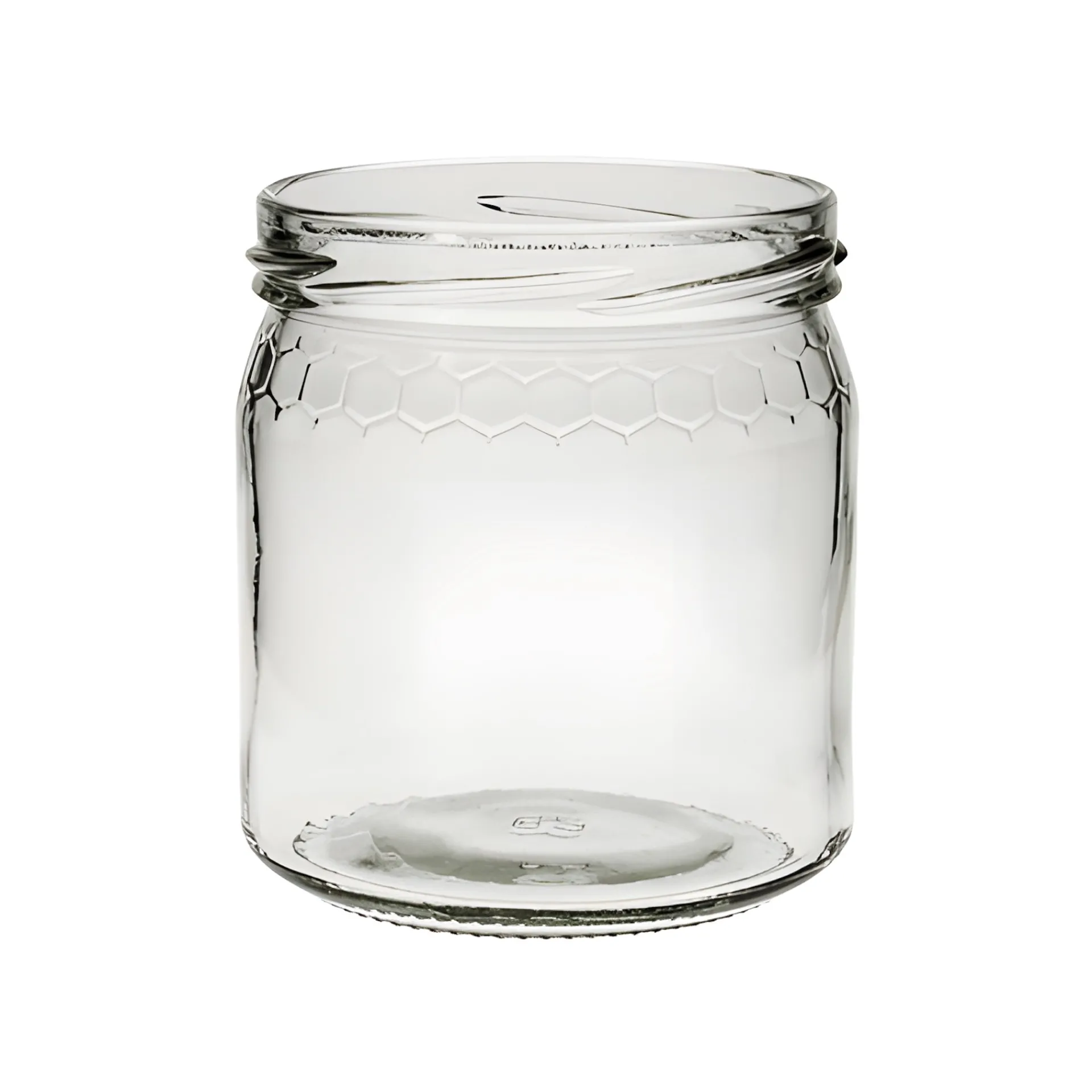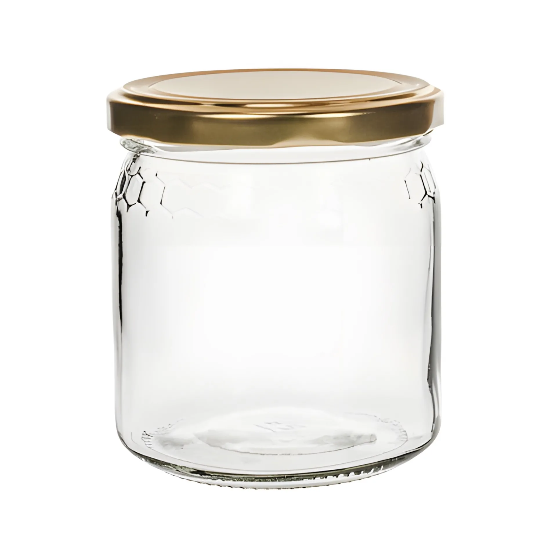 Gläserner Honigtopf mit schönem Wabenrelief, das besonders gut in Erscheinung tritt, wenn das Einmachglas mit süßen Leckereien befüllt ist. Die zeitlose Form und die weite Öffnung machen das Glas zur perfekten Verpackung für Honig, Zuckersirup, Gelee und andere zähflüssige Aufstriche.