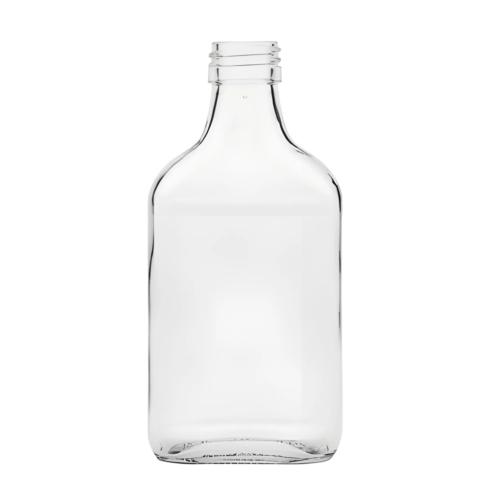 Die schlichte Flasche aus klarem, stabilem Glas hat eine flache Form und erinnert an einen klassischen Flachmann, den man sich unauffällig in die Tasche steckt. Sie hat eine Mündung für einen praktischen Schraubverschluss und kann auslaufsicher transportiert werden. Ideal zum Mitnehmen wärmender Spirituosen bei winterlichen Wanderungen oder zum Picknick.