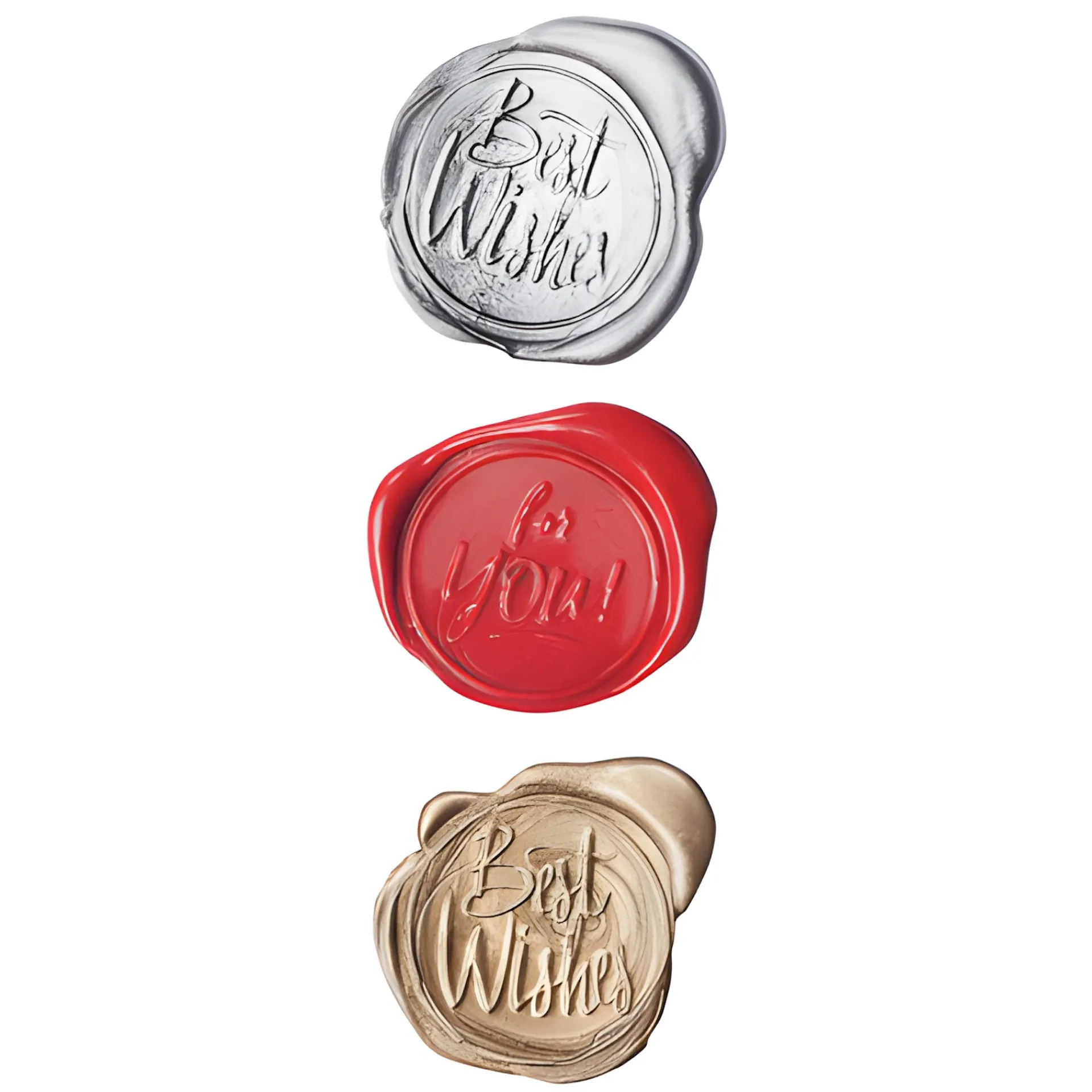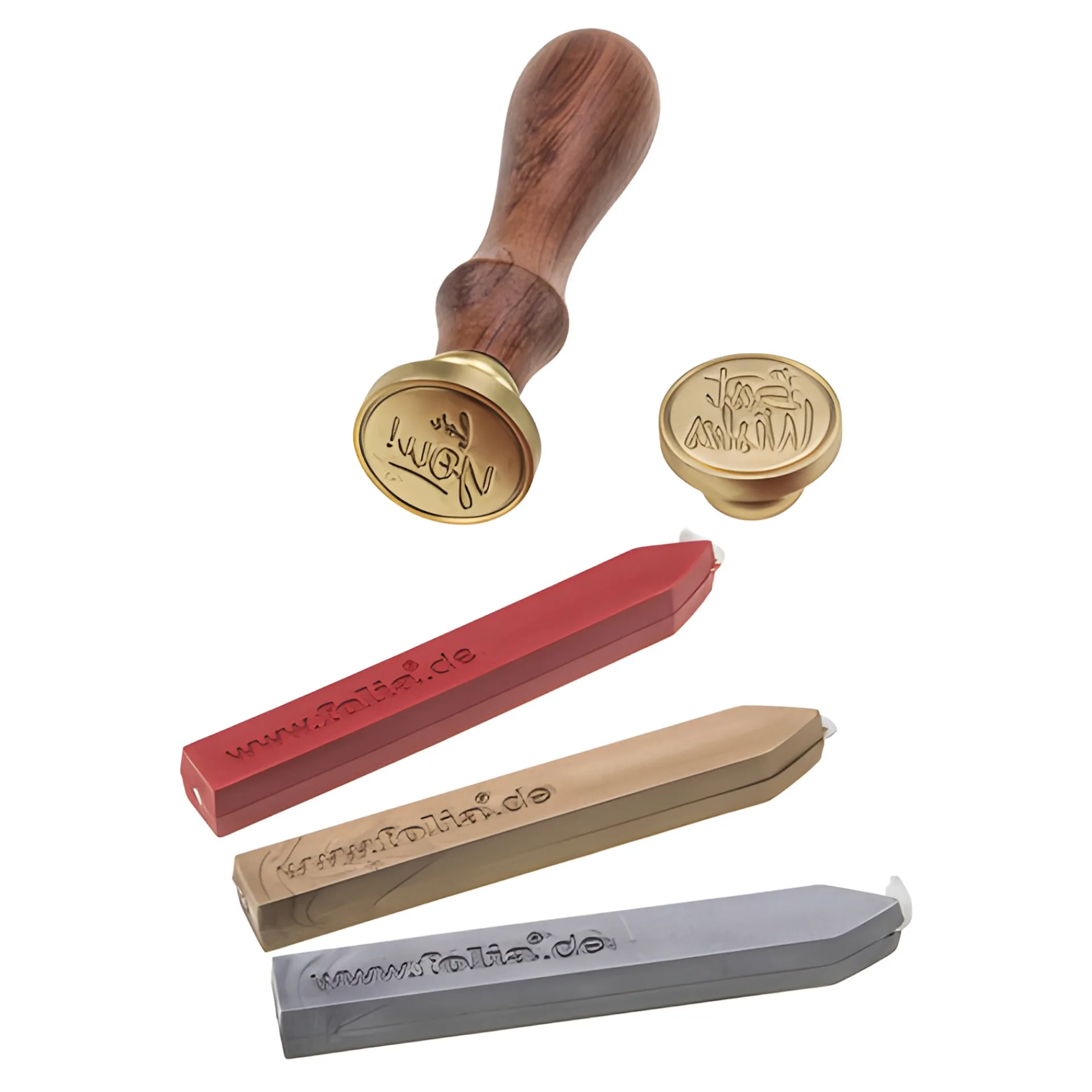 Das Set besteht aus 2 Siegelplatten (‚Best Wishes‘ und ‚for you‘), je einer Stange Siegelwachs mit Docht in Rot, Gold und Silber und einem hochwertigen Siegelgriff aus Holz.