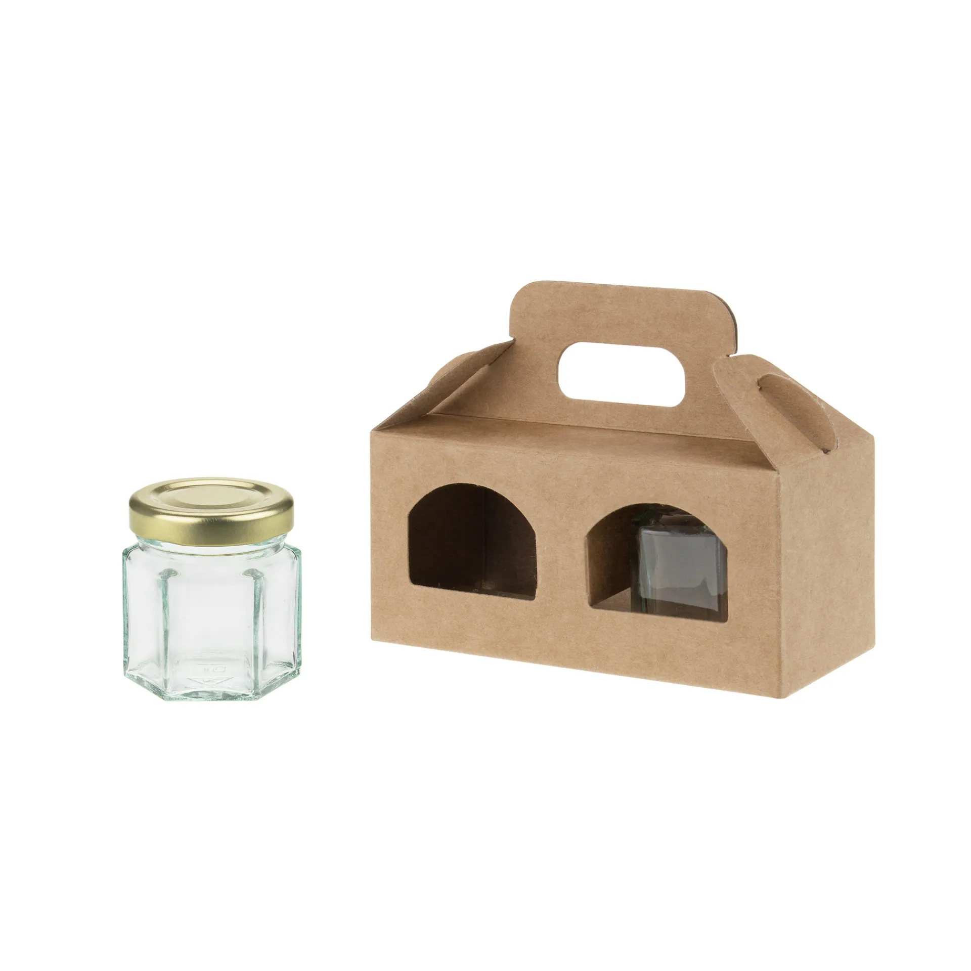 Kleiner Karton zur Aufbewahrung, Präsentation oder den Transport zweier kleiner Gläser. Sichtfenster geben den Blick auf den Inhalt frei, die eingeklappten Laschen halten die Gläser an ihrem Platz und verhindern einen direkten Kontakt. Durch den pfiffigen Faltmechanismus ist der Karton in drei einfachen Schritten einsatzbereit, und der praktische Tragegriff erleichtert die Handhabung.