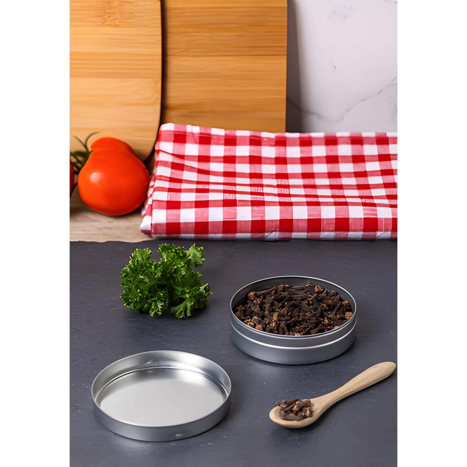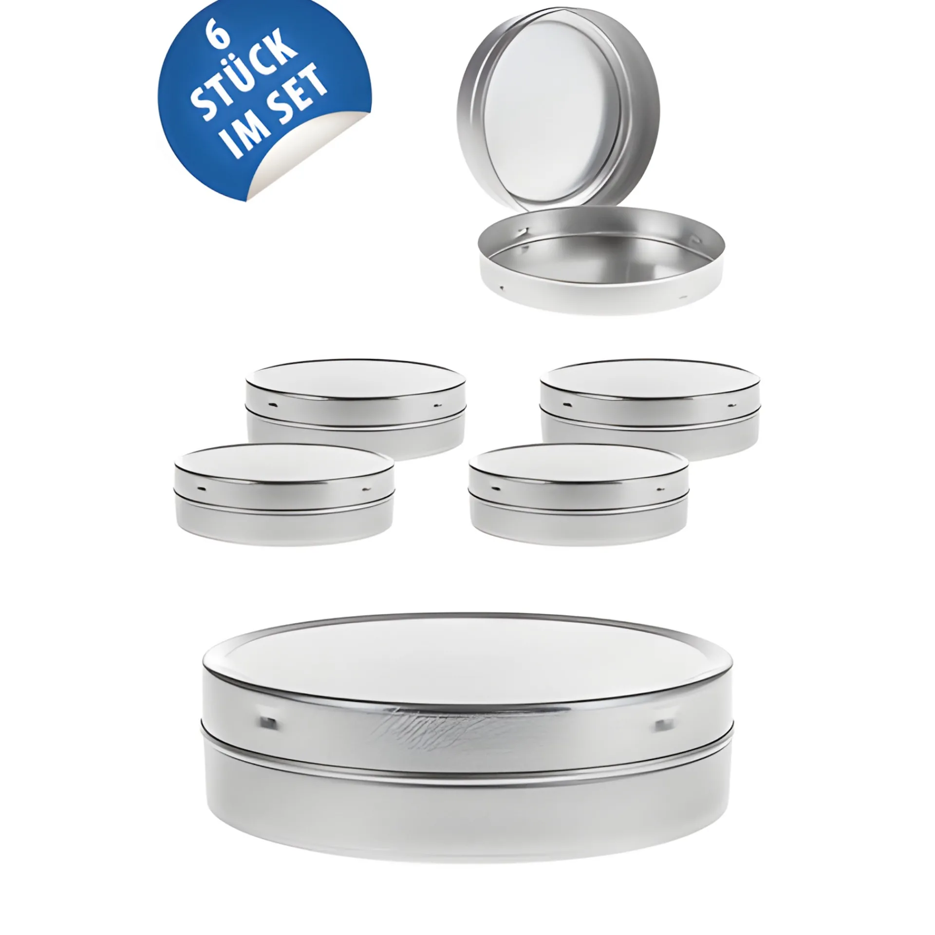 Silberne Metalldose mit Deckel im 6er Pack zur idealen Aufbewahrung von Süßigkeiten und Gewürzen. Die leichte Bonbondose aus Weißblech ist lebensmittelgeeignet und prima für selbstgemachte Drops, getrocknete Fruchtstücke oder leckerer Schokolade zum Naschen geeignet. Als originelle Gewürzdose verwendet, finden auch frische Gartenkräuter hier getrocknet und lichtgeschützt ihren Platz. Durch ihre Form sind die flachen Dosen prima stapelbar und passen so platzsparend ins Regal. Als Geschenk oder kleines Mitbringsel kann die Dose ebenfalls verwendet werden – einfach mit einem schönen Etikett und einer Schleife verzieren und fertig ist die Aufmerksamkeit.