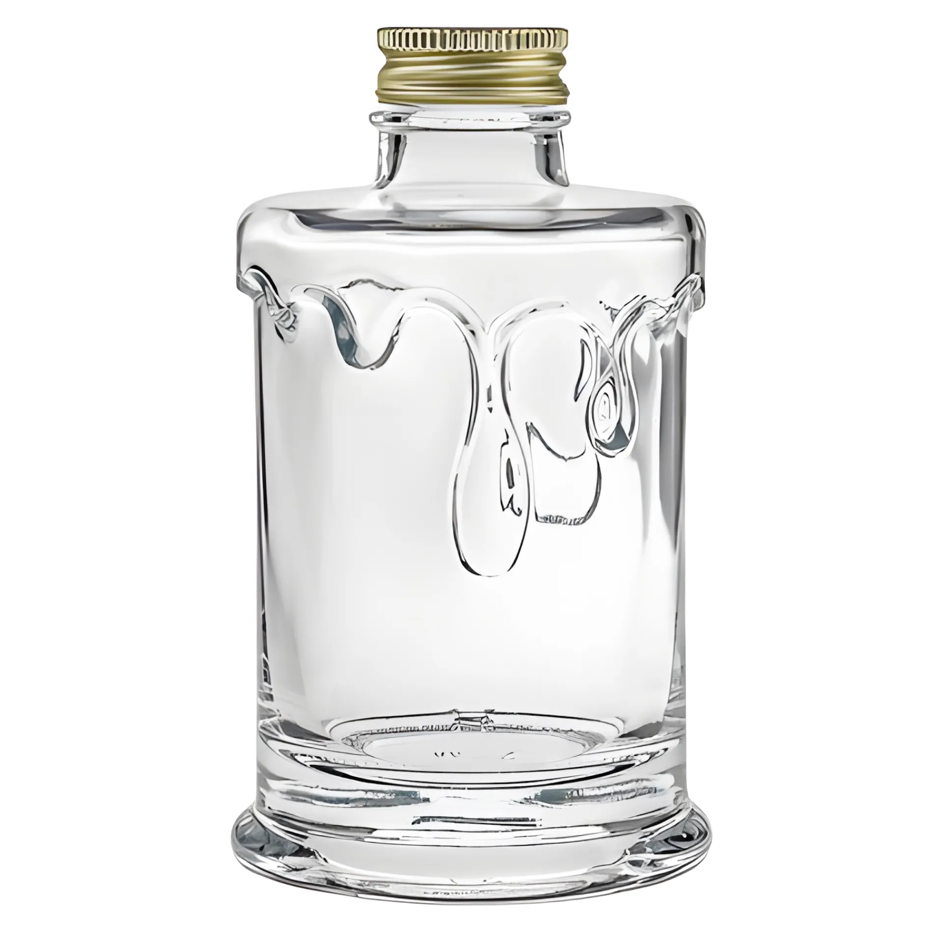 Die hübsche, runde Schmuckflasche mit kurzem Hals und schwerem Boden hat die Form einer kompakten Stumpenkerze und ist ideal zum Verschenken von selbstgemachtem Sirup und Likör. Der Clou dieser ausgefallenen Glasflasche ist die plastisch gestaltete Verzierung ihrer Oberfläche: Es sieht aus, als ob flüssiger Wachs an der Flasche herunterlaufen würde. Besonders schön kommt dieses Motiv zur Geltung, wenn die Flasche mit einem Inhalt in kräftigen Farben befüllt wird: z. B. mit rotem Granatapfelsirup oder goldgelbem Orangenlikör. Die Flasche hat eine GPI-Mündung für einen entsprechenden Schraubdeckel, wodurch sie sich luftdicht und auslaufsicher verschließen und prima transportieren lässt. Durch den schweren Boden hat sie einen sicheren, stabilen Stand.