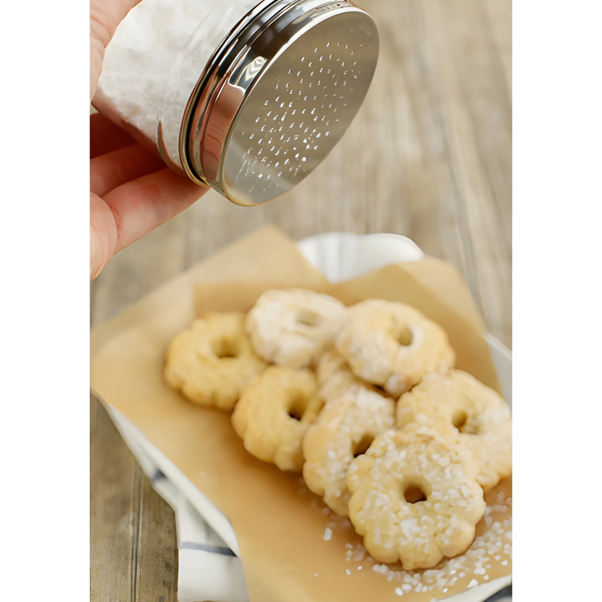 Der edle Deckel aus Edelstahl ist dank seiner kleinen Löcher ein praktischer Küchenhelfer, mit dem das Bestreuen einfach von der Hand geht. So können Sie Puderzucker aus dem Vorratsglas über Waffeln, Vanillekipferl oder Crêpes streuen. Oder beim Durchkneten eines Brotteiges, diesen mit einem Griff mit Mehl bestäuben, sodass dieser nicht klebt.