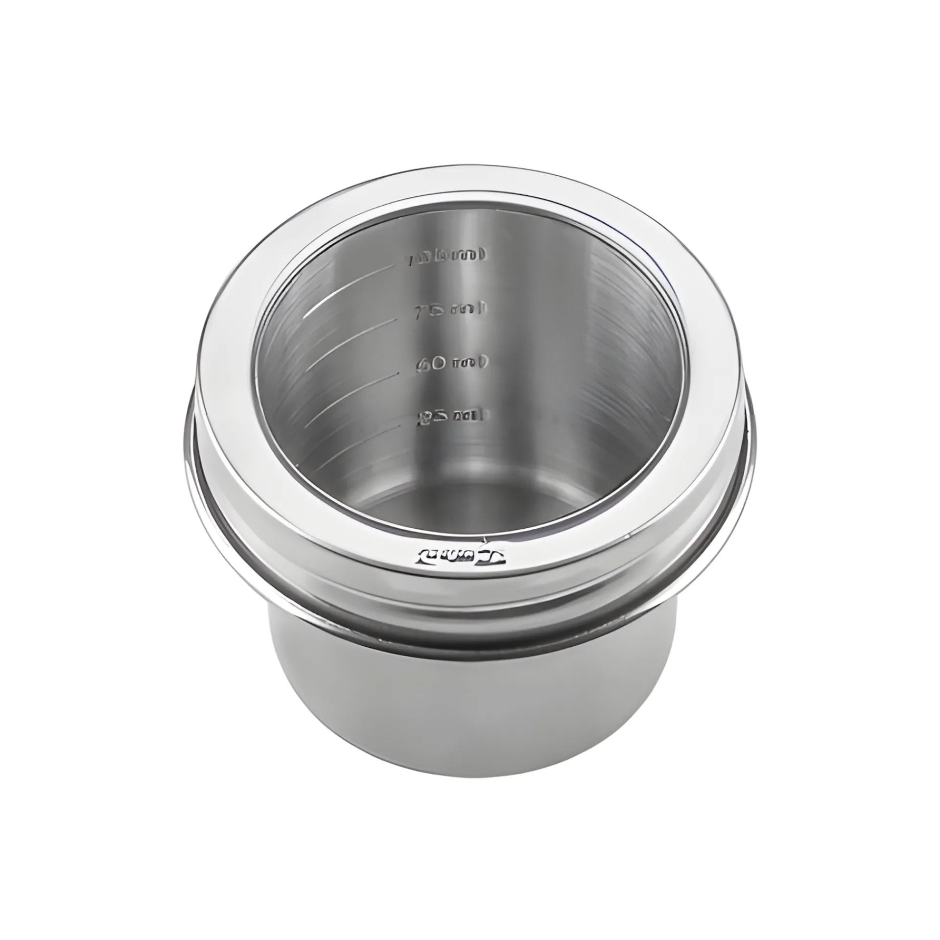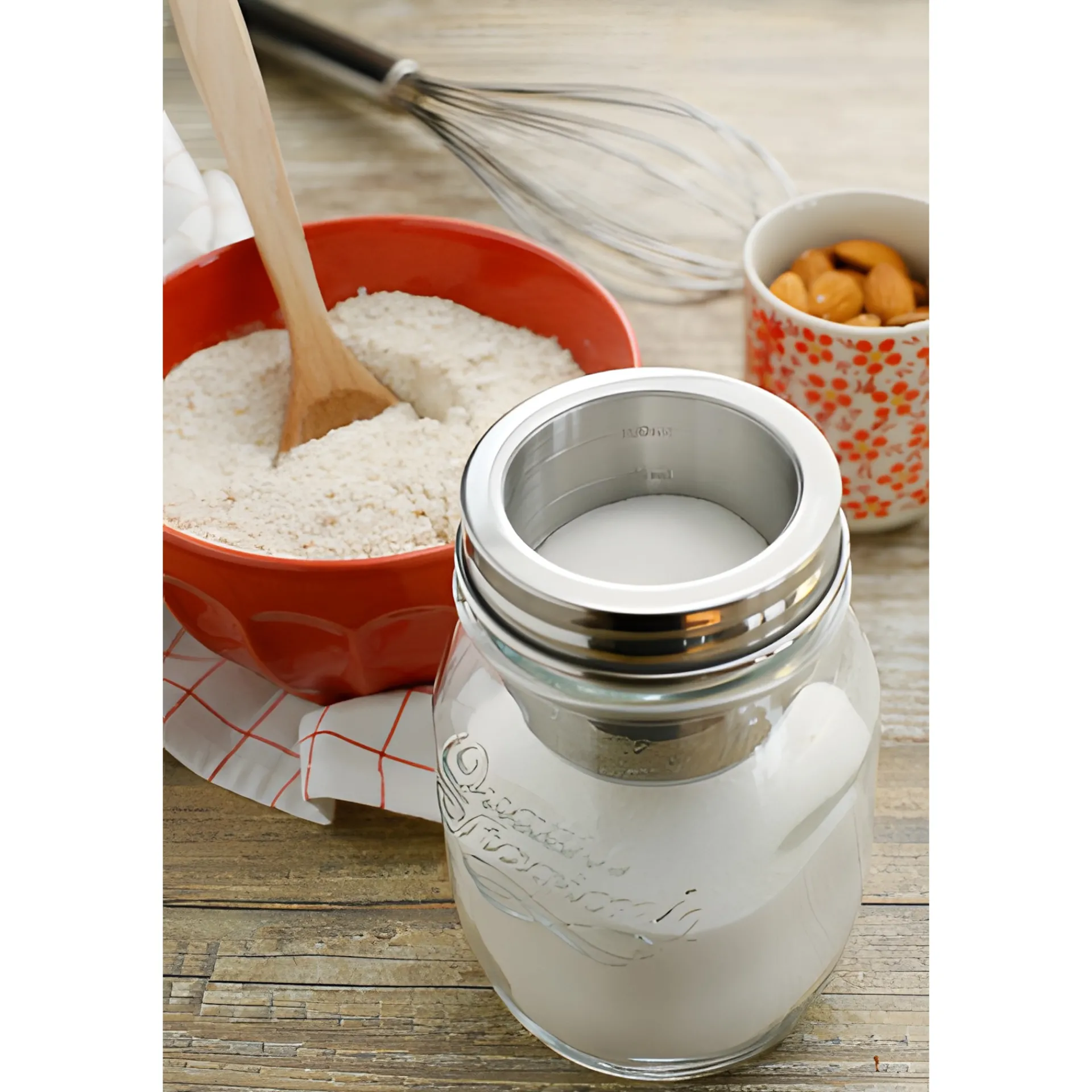 Mit dem edlen Deckel lassen sich Vorratsgläser sicher verschließen und mit dem Edelstahl-Messbecher die gewünschte Zutatenmenge genau dosieren. Dafür ist eine 4-stufige Skala von 25 -100 ml im Inneren der Dosierhilfe zu finden.