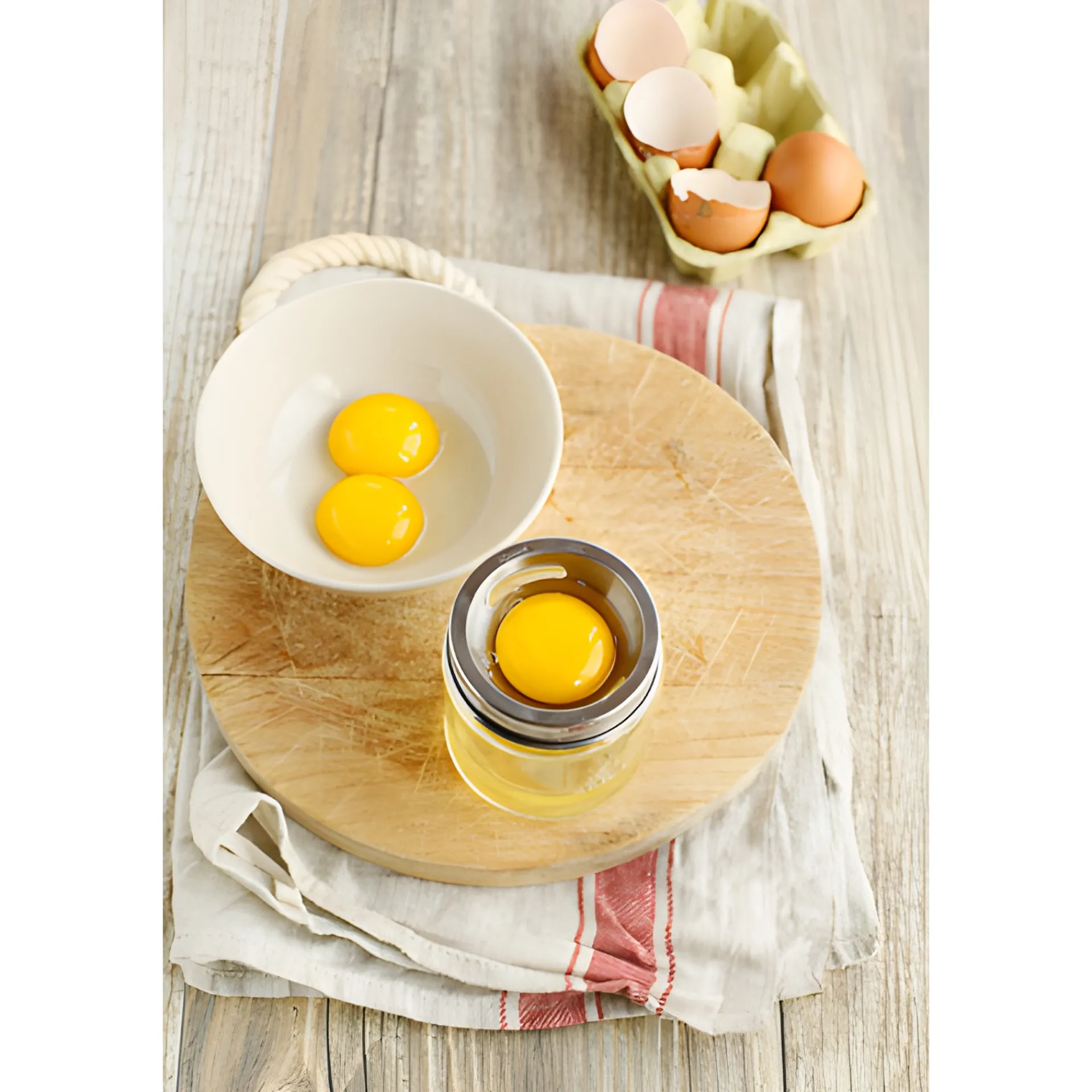 Hinweis: Bei frischen Eiern empfehlen wir das Trennen von Hand, da das Eiweiß noch recht fest am Eigelb sitzt.