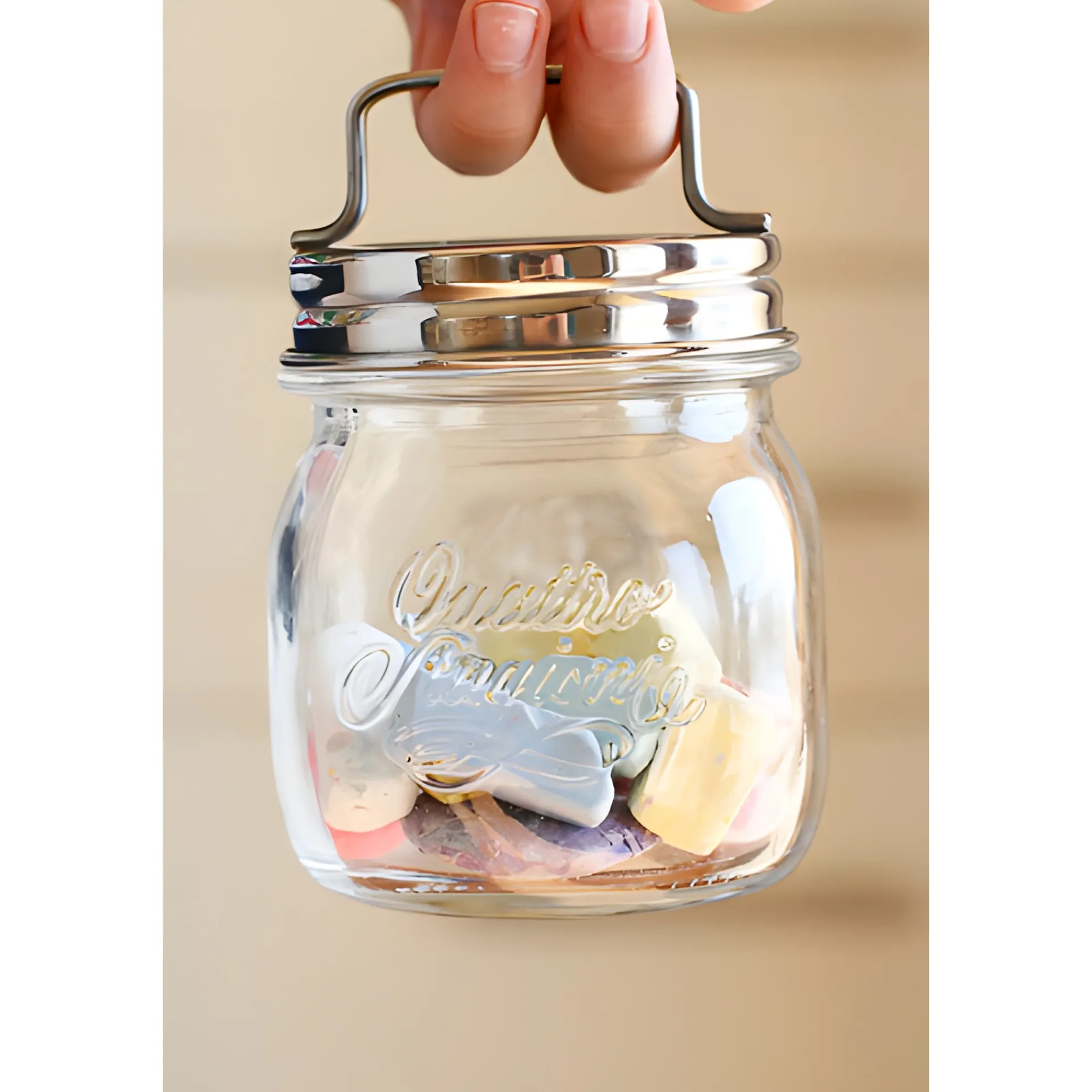 Praktischer Deckel mit Haltegriff, mit dem Vorratsgläser überall ihren Platz finden. Durch den handlichen Griff am Edelstahl-Verschluss kann das Glas an Haken oder Stangenhalterungen angehängt werden, so hat man einen guten Überblick und gleichzeitig alles schnell griffbereit.
