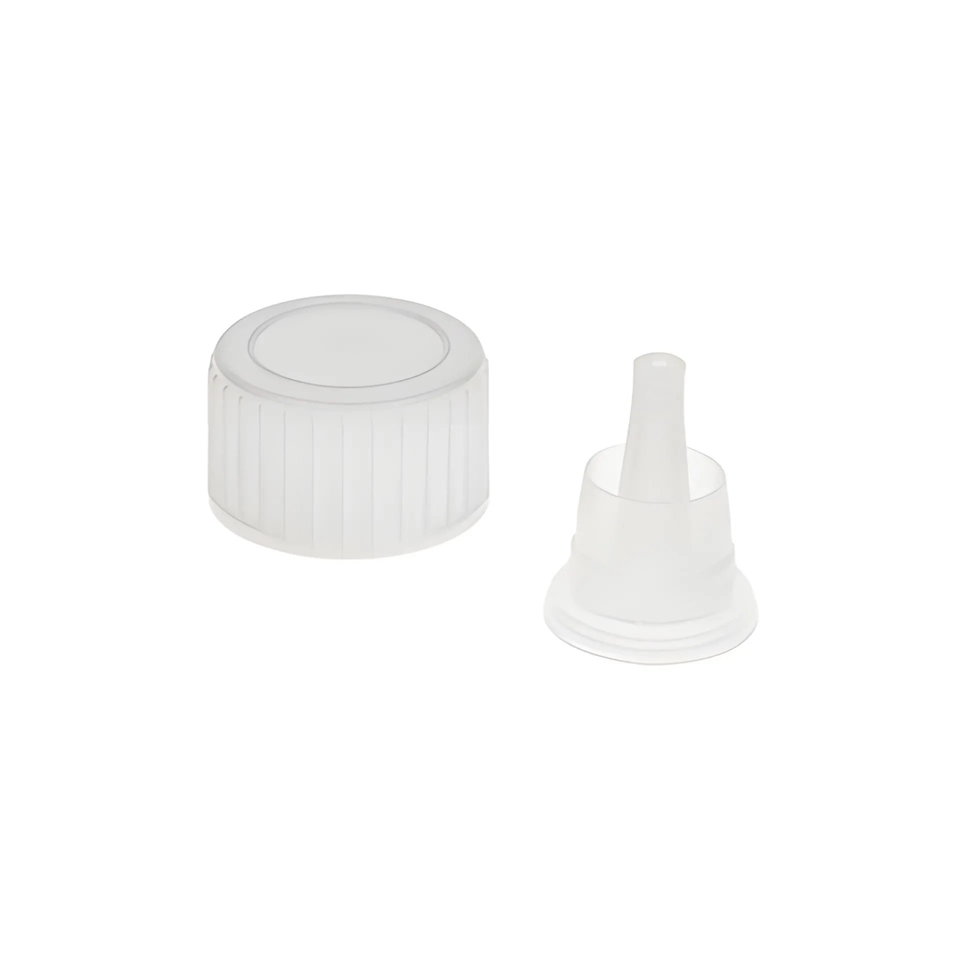 Zu dem weißen Schraubverschluss gehört ein transparenter Randtropfer (R4) für Flüssigkeiten, mit dem ganz leicht dosiert werden kann. Einfach raufschrauben und schon wird der Tropfverschluss in die Flaschenöffnung gepresst und dort gut befestigt. Für eine bestmögliche Tropfendosierung sollte die Dosierhilfe in einem ungefähren Winkel von 45° gehalten werden.