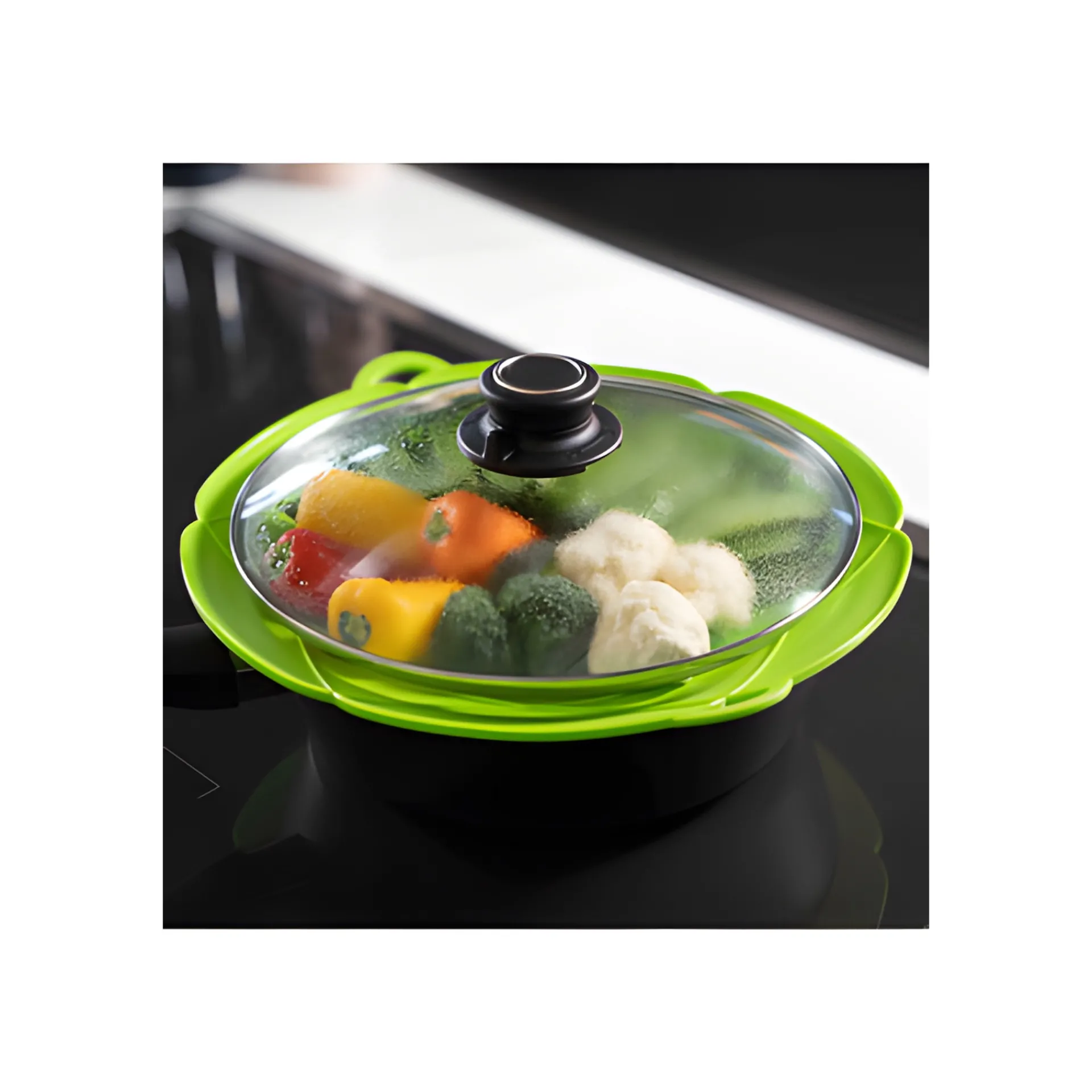 Auch Dampfgaren kann man mit diesem vielseitigen Allrounder, indem man den Überkochschutz z. B. mit Gemüse auf einen Topf mit kochendem Wasser legt und ihn mit dem Topfdeckel bedeckt. So wird das Gemüse schonend und energiesparend gedämpft. Außerdem kann man ihn als Spritzschutz auf der Pfanne, im Backofen oder in der Mikrowelle verwenden. Man vermeidet dadurch lästige Fettspritzer und Herd und Backofen bleiben sauber.
