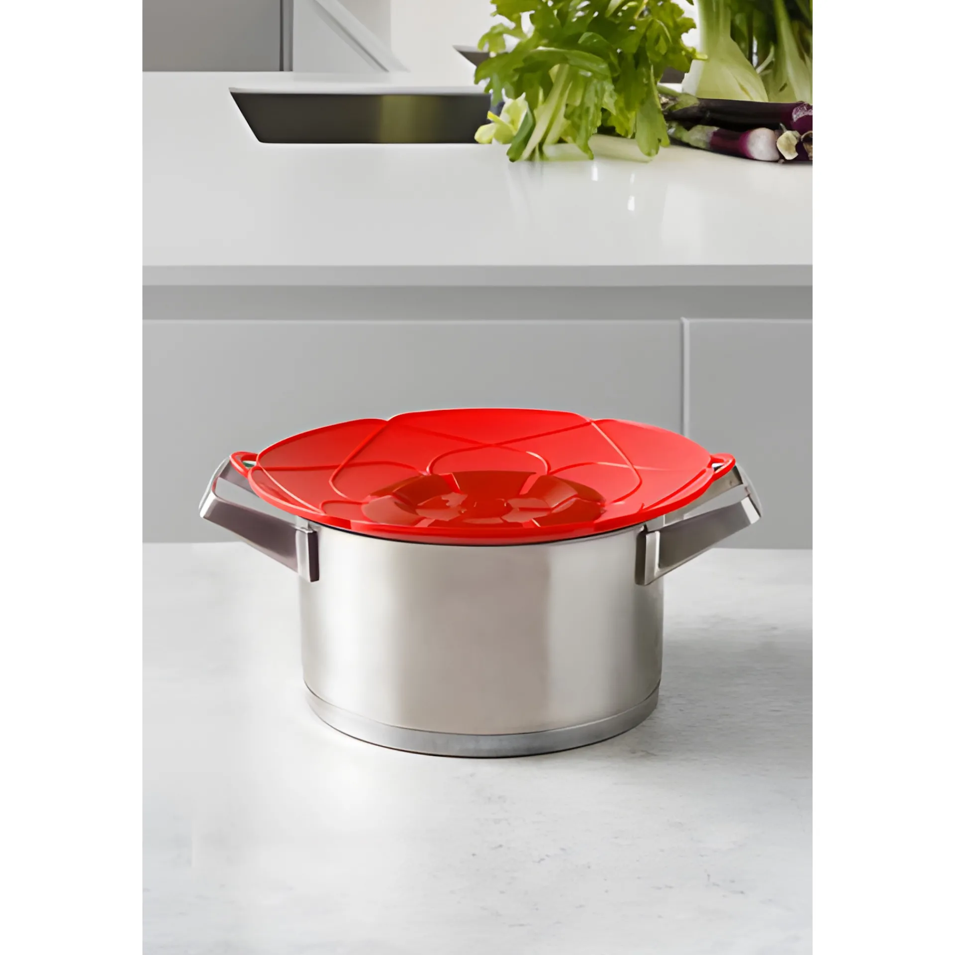 Der mohnblumenrote Überkoch-Stopper passt auf Töpfe und Pfannen mit einem Durchmesser von 14 bis 20 cm. Er ist aus lebensmittelechtem Silikon, hitzebeständig bis 260 °C und spülmaschinenfest.