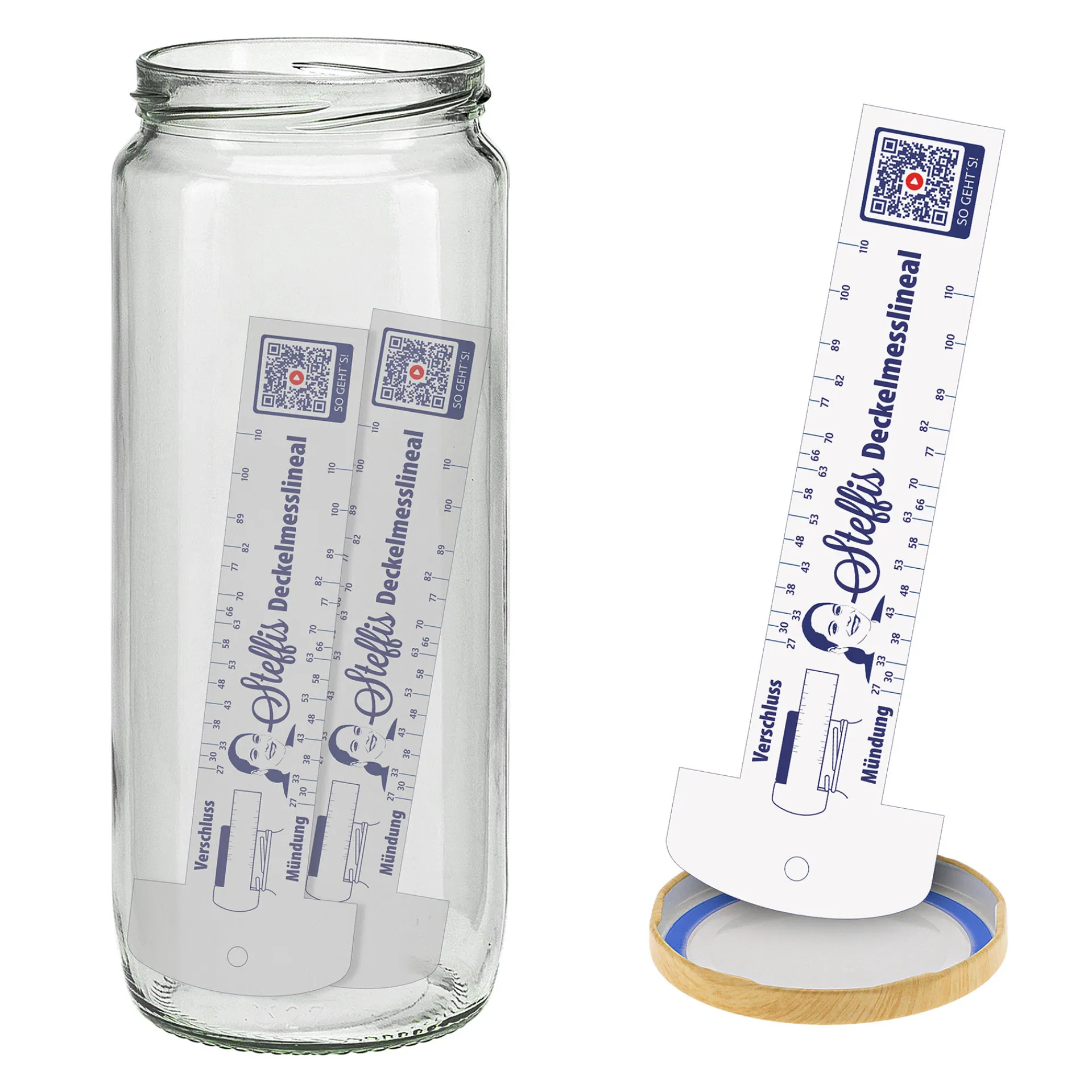 Ebenfalls im Set enthalten ist ‚Steffis Deckelmesslineal‘ in 3-facher Ausführung. Mit ihm kann die passende Verschluss-Größe für TO-Gläser bequem ausgemessen werden. Dafür legen Sie das praktische Deckelmesslineal einfach an den Steg Ihres Glases oder dem Deckel an, und auf einer der beiden Skalen kann die entsprechende Größe abgelesen werden.