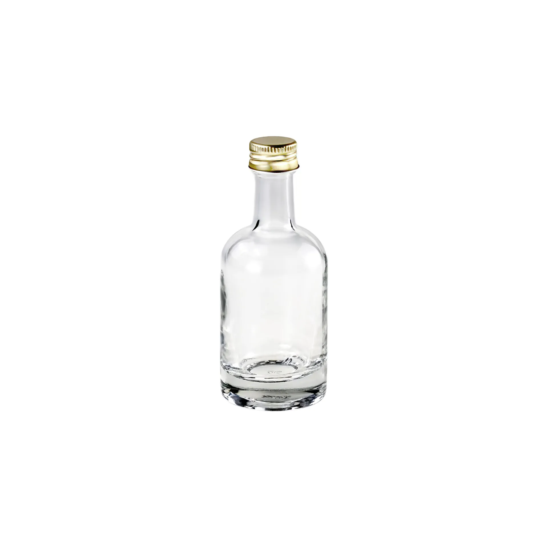 Die hübsche kleine Glasflasche ist mit einem Volumen von 50 ml ein ideales Portions- und Probierfläschchen für selbstgemachten Sirup, Saft, Likör, Shots oder auch aromatisiertes Öl und Essig. Sie hat eine PP-18-Mündung für einen auslaufsicheren Schraubdeckel und lässt sich daher gut verschließen und transportieren. Aufgrund ihrer ansprechenden Form mit abgerundeten Schultern, einem schweren, soliden Boden und ihrer geringen Füllmenge eignet sie sich perfekt als schöne Verpackung für Mitbringsel, Gastgeschenke und Kostproben. Mit einem gold- oder silberfarbenen Aluminium-Verschluss (auch mit Originalitätsring) oder einem dekorativen Holzdeckel kombiniert, machen die Miniflaschen viel her.