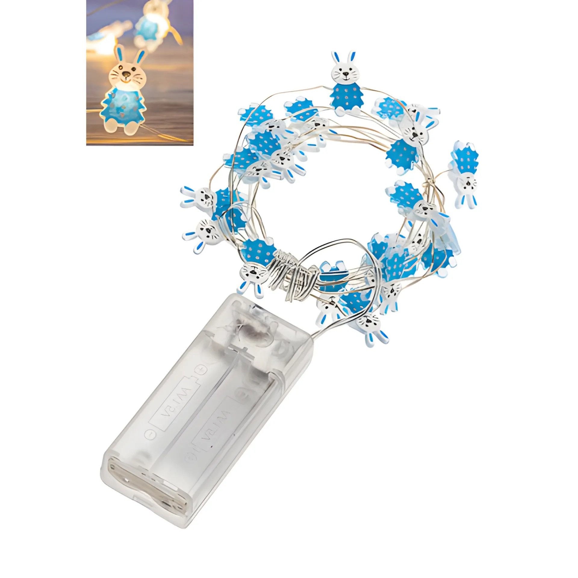 Schöne Lichterkette mit niedlichen Osterhasen und 20 LED-Lichtern. Die kleinen blau-weißen Häschen aus Kunststoff werden von warmweißen LEDs beleuchtet und hängen an einem biegsamen Draht. Dieser kann prima ins Osterkörbchen oder auch in selbst gepflückte Weidenzweige gehangen werden – eine ideale Osterdeko. Die LED-Lichterkette mit Batteriestation passt auch prima in große Vorratsgläser, die mit Ostergras und bunten Eiern dekoriert sind. Wenn Sie ein Glas mit einem genügend großen Verschluss haben, kann man das Batteriefach sogar darunter kleben.