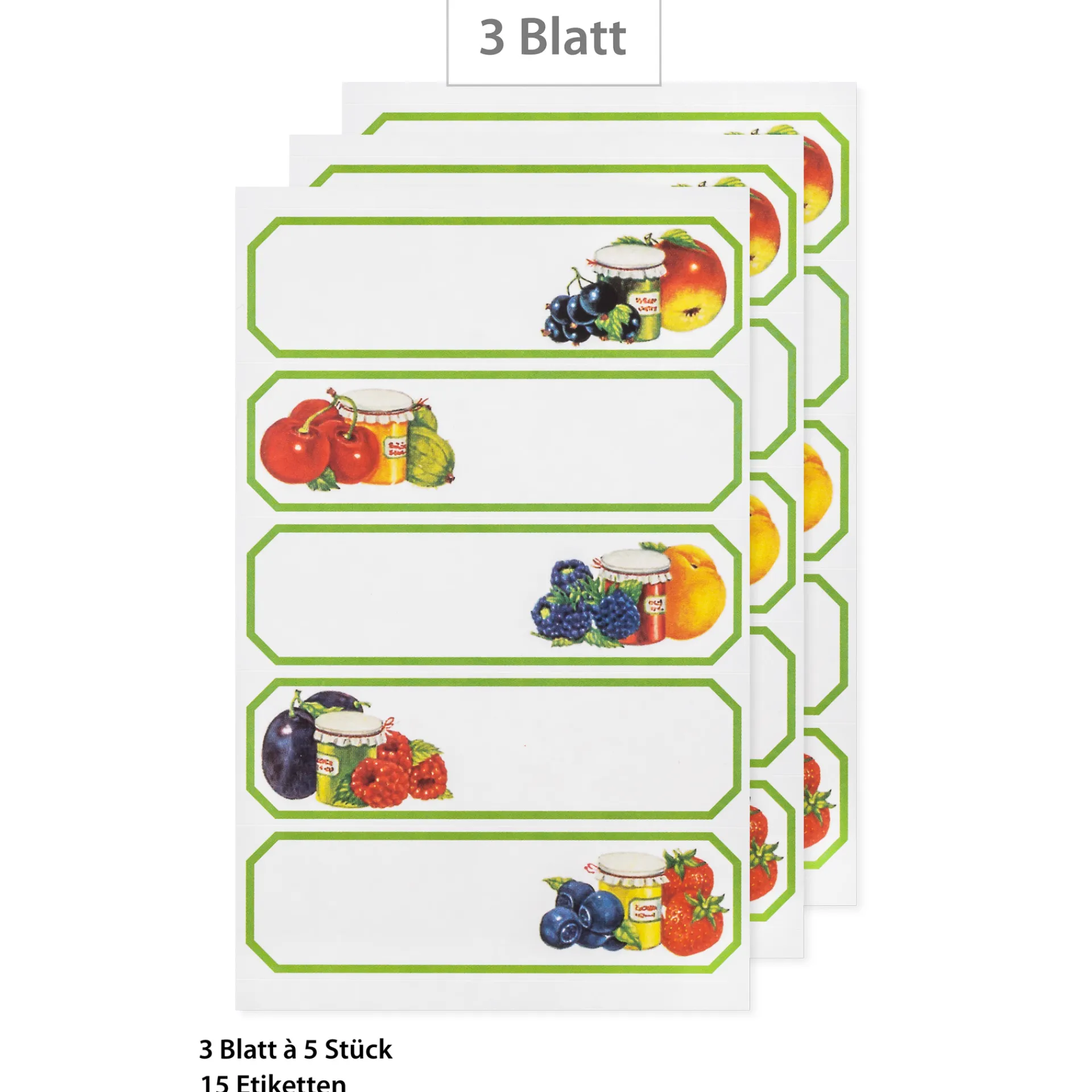 Hübsche Etiketten mit grünem Rahmen und verschiedenen Obstsorten. Sie eignen sich besonders gut zum Beschriften von Gläsern und Flaschen.