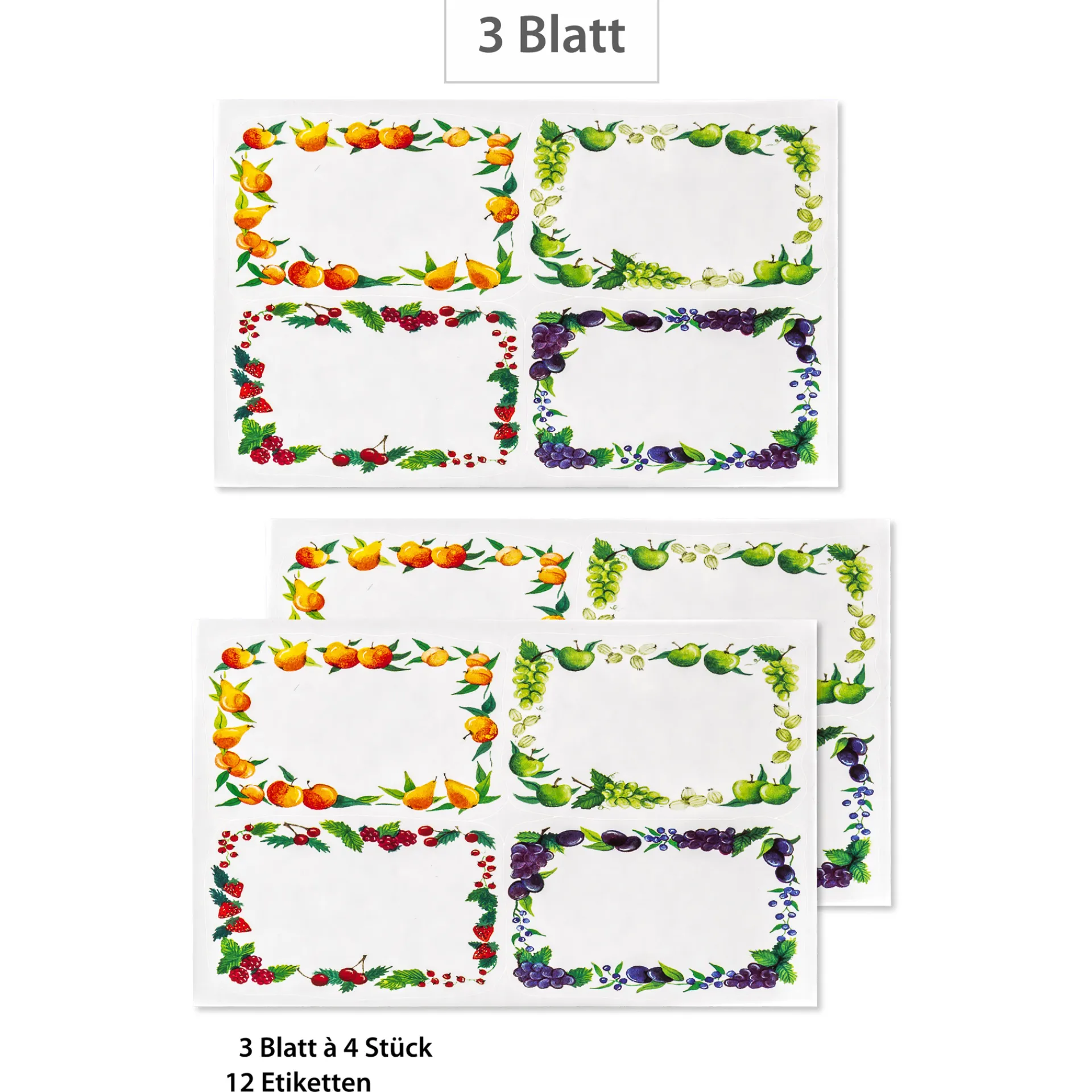 Hübsche Etiketten mit einem Rahmen aus verschiedenen Obstsorten. Sie eignen sich besonders gut zum Beschriften von Gläsern und Flaschen.