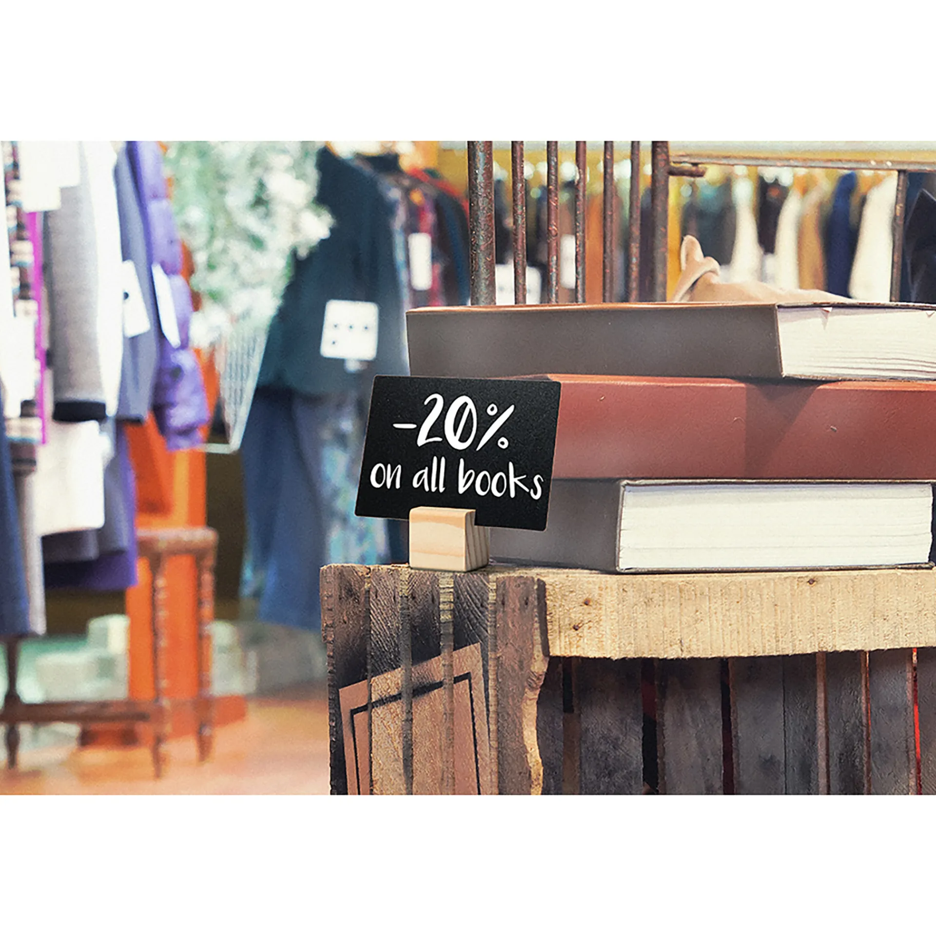 Mit den kleinen Kreidetafeln kommen Ihre Produkte ganz groß raus. Sie werden einfach in die beiliegenden Teakholz-Halterungen gesteckt und können so zwischen oder vor Ihren Waren platziert werden.