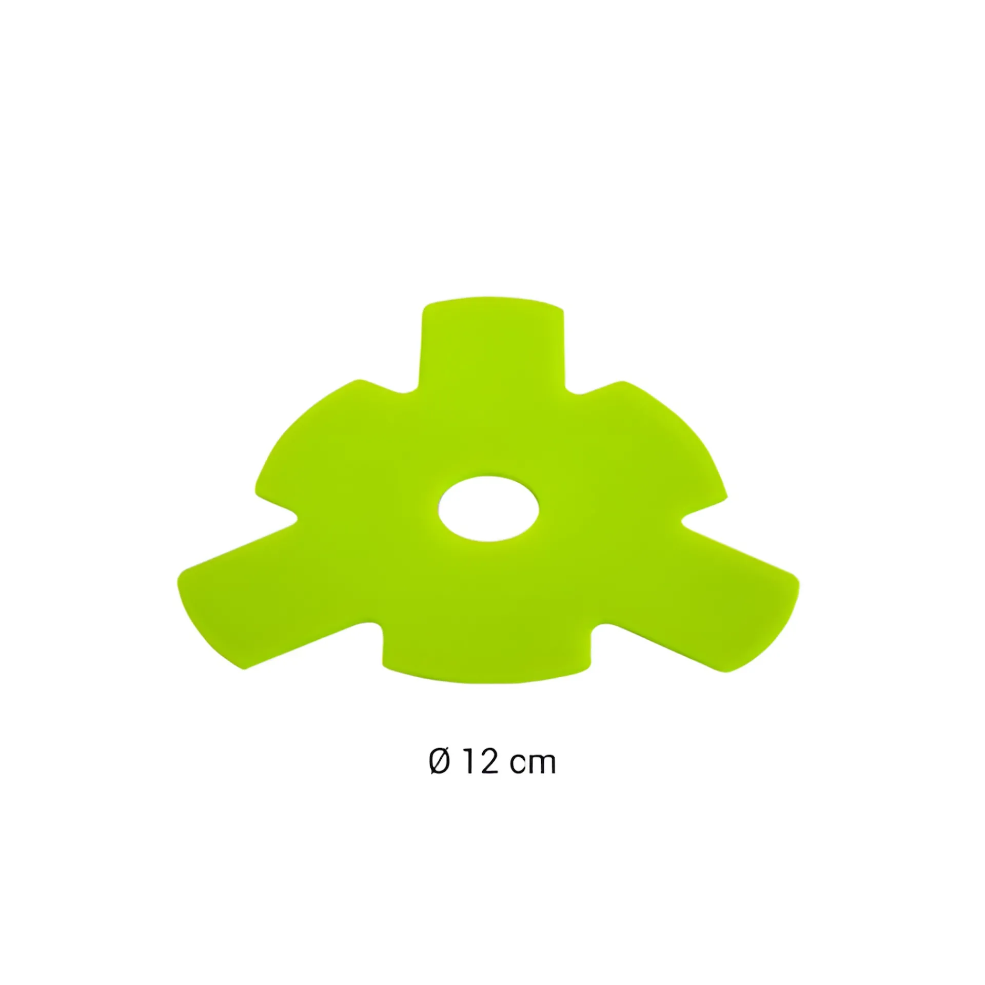 Die Fermentier-Druckscheibe hat einen Durchmesser von 12 cm. Sie ist sternförmig, hat 6 unterschiedlich lange und breite Zacken, die man nach Bedarf umbiegen kann, und in der Mitte ein Loch, das für die Durchlässigkeit der Flüssigkeit sorgt.