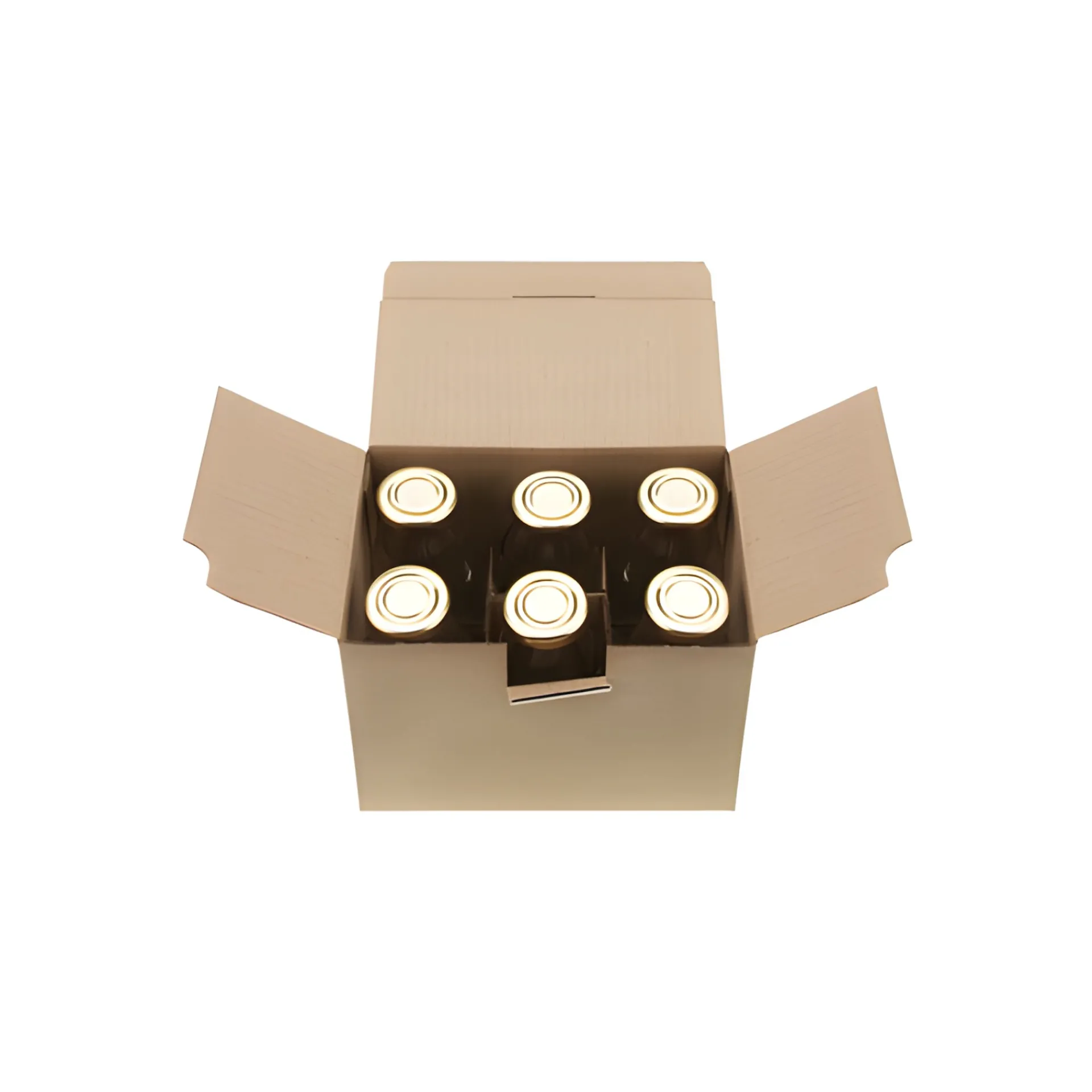 Dieser Verpackungskarton mit Automatikboden bietet Platz für 6 hohe Gläser oder kleine Flaschen. Produziert wurde er speziell für die Hansaflasche 250 ml, die perfekt in die abgetrennten Fächer passt. Durch den praktischen Faltungsmechanismus ist der Versandkarton mit einem Handgriff einsatzbereit. Abtrennungen aus Karton sorgen für sicheren Halt und verhindern den direkten Kontakt der Gläser.