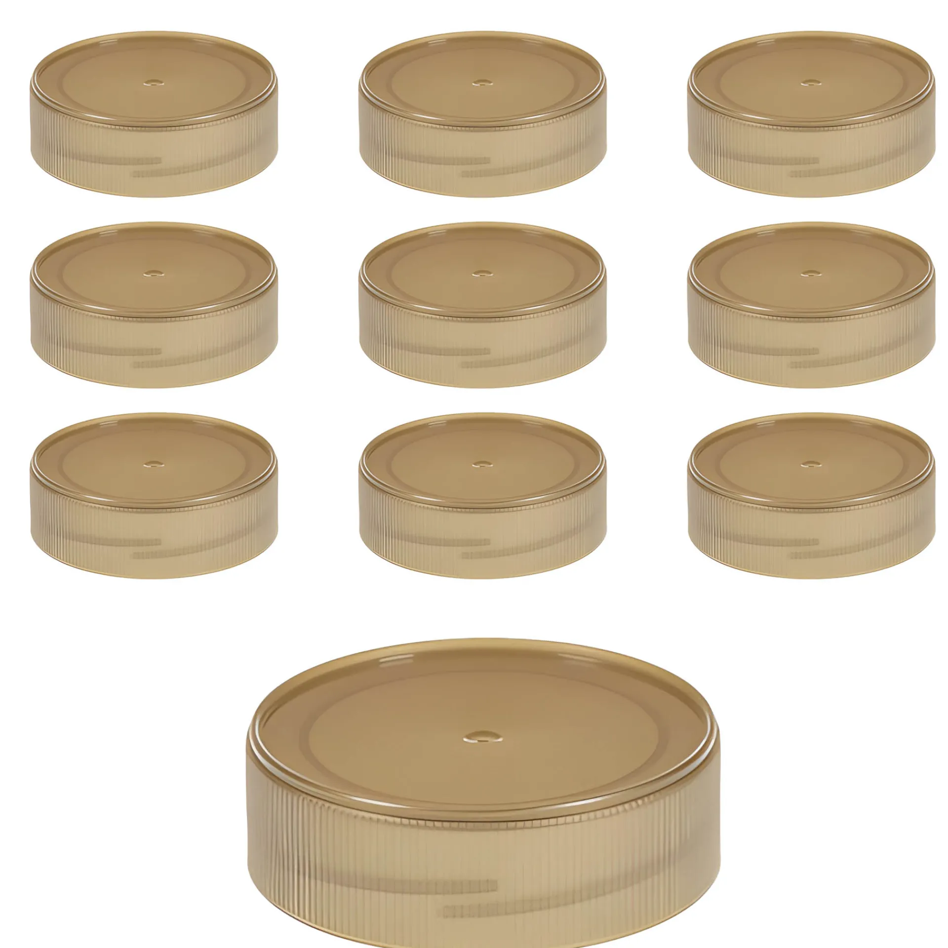 Der goldfarbene Twist-Off-Deckel aus Kunststoff im praktischen 10er-Pack passt auf Gläser mit einer TO 58 Mündung und einer entsprechend hohen Mündung. Der Verschluss ist höher als normale TO 58 Verschlüsse (18 mm) und passt somit nur auf TO 58 Gläser (äußerer Öffnungsdurchmesser des Glases ohne Gewinde ca. 52,8 mm), die eine entsprechend hohe, freie Mündung haben, wie z.B. die meisten Rundgläser. Für Gläser mit Transferring (Wulst unter der Mündung, wie bei den meisten Sturzgläsern) ist er nicht geeignet.