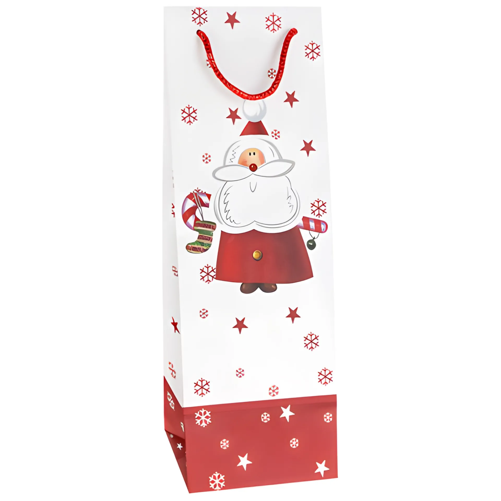 Schön verzierte Flaschentasche mit einem 3D Weihnachtsmann, der auf der Vorderseite ein kleines Glöckchen mit sich trägt. Die stabile Papier-Tragetasche ist in den Farben rot und weiß gehalten, mit Schneeflocken und Sternen verziert und hat eine rote Tragekordel an der eine Karte zum Beschriften befestigt ist. Sie eignet sich perfekt für Geschenke und breitere Flaschen in der Weihnachtszeit, auch eine Whiskey-Karaffe findet in dieser Verpackung ausreichend Platz.