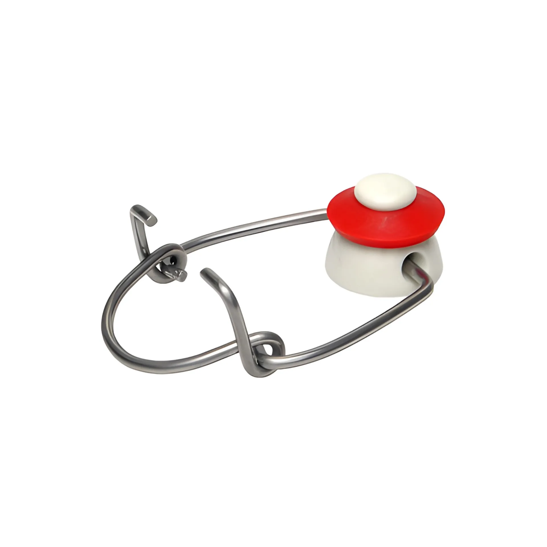 Der Drahtbügelverschluss mit klassischem, weißem Porzellankopf und rotem Gummiring passt auf Bügelflaschen mit einem Öffnungsdurchmesser von ca. 18 mm. Am Flaschenhals befinden sich zwei Mulden, in welche die Metallbügel festgesteckt werden.