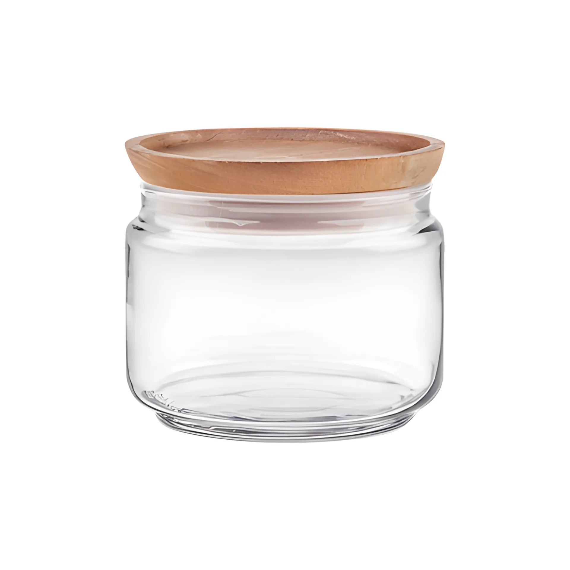 Moderner Vorratsbehälter aus Klarglas mit attraktivem Holzdeckel aus Kiefernholz, der Lebensmittel luftdicht verschließt. Tee, Gebäck, Bonbons und Trockenvorräte können in diesem Glas optimal gelagert werden, Füllmenge und Inhalt bleiben dabei trotzdem sichtbar. Der besondere Holzverschluss mit einer Kunststoffdichtung mit Lamellen ist an den Seiten leicht erhöht, dadurch wird das Glas stapelbar. Alle Gläser der Pure Jar-Serie haben den gleichen Durchmesser und können untereinander kombiniert werden.