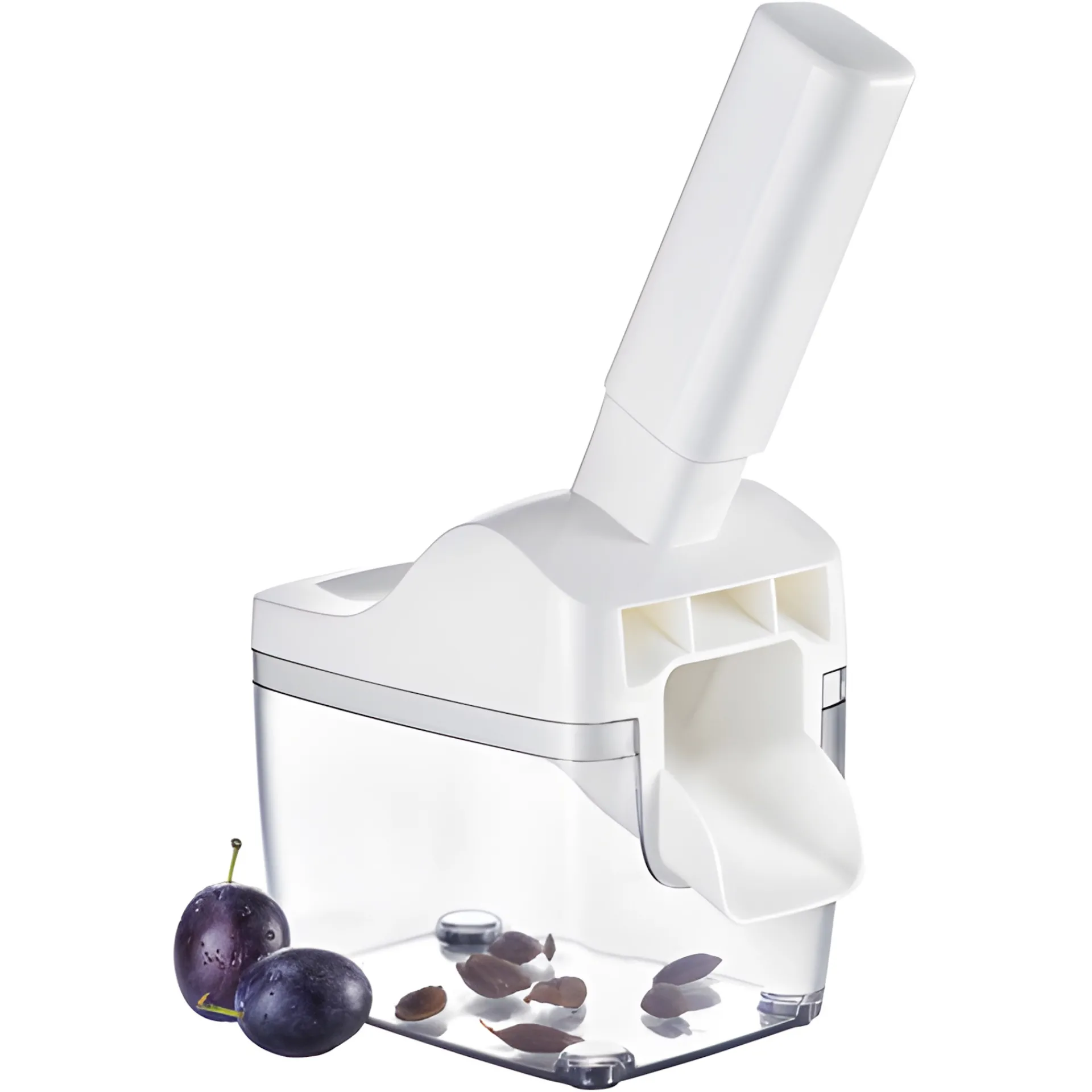 Die robuste Entsteiner-Einheit mit einem extra geschliffenen Kreuzmesser aus Edelstahl kann bis zu 15 kg Früchte in einer Stunde in küchenfertige Form bringen.