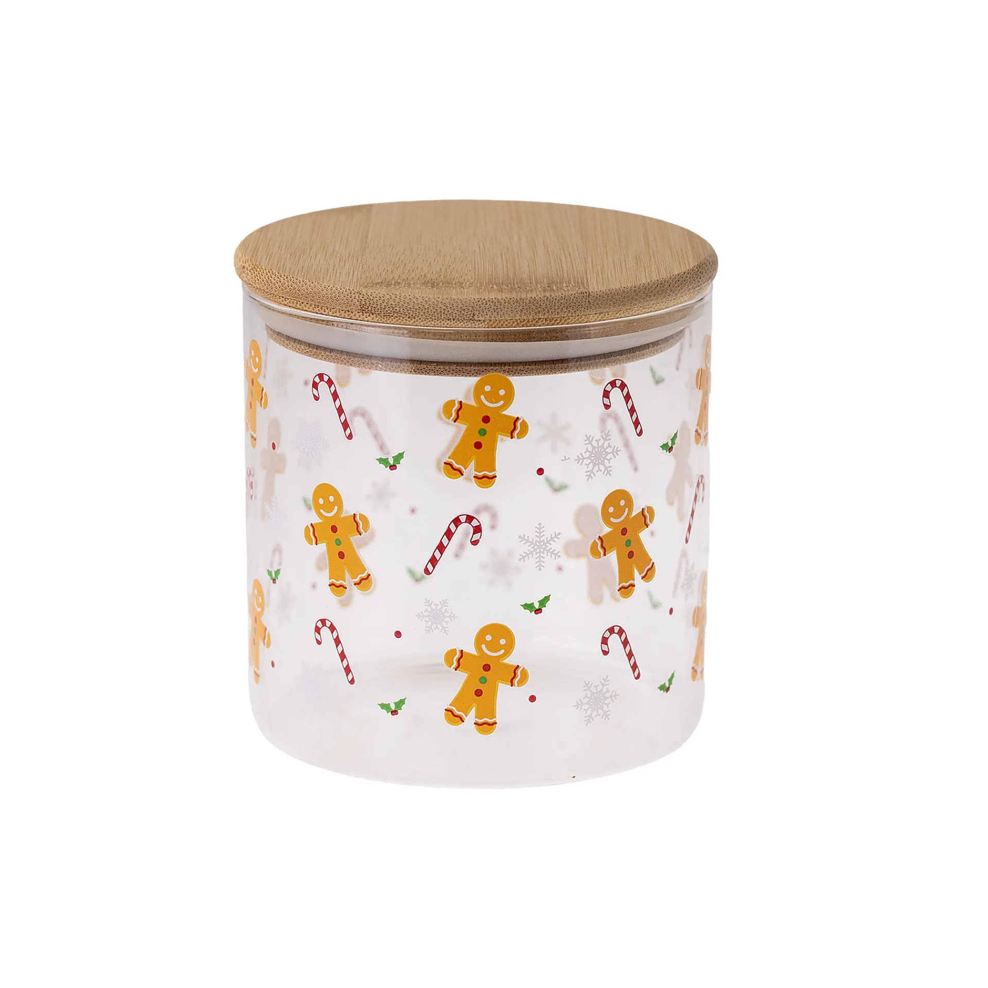 Das hübsche runde Glas mit dem schönen Holzdeckel ist ideal zum Aufbewahren oder Verschenken von selbstgebackenen Weihnachtsplätzchen, Pfefferkuchen und anderen weihnachtlichen Süßigkeiten. Rundherum ist es dekoriert mit vielen kleinen Lebkuchenmännern, Zuckerstangen und Schneeflocken, die genug Platz für einen Blick auf den leckeren Inhalt im Glas lassen.