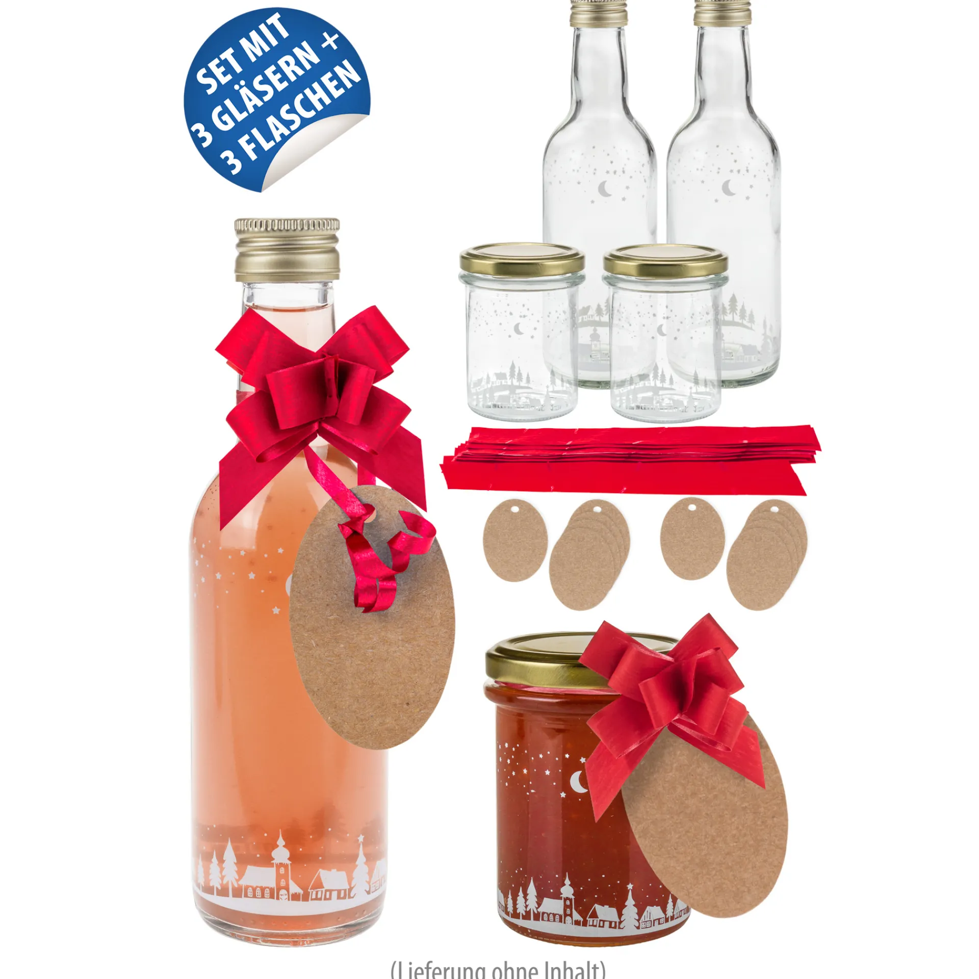 Weihnachtliches Gläserset mit einer hübschen Winterlandschaft, in der selbstgemachter Likör, Saft und Marmelade perfekt zur Geltung kommen. Die winterliche Motivflasche ist dezent und gleichzeitig detailliert bedruckt, sodass Selbstgemachtes in dieser Flasche zum tollen Weihnachtsgeschenk wird. Das Marmeladenglas im gleichen Stil ergänzt die Weihnachtsflasche und hat eine ideale Größe für Gelee und auch leckeren Kuchen im Glas. Die entsprechenden Verschlüsse sind in Gold gehalten, die super zur roten Ziehschleife passen. Das naturfarbene Anhängeetikett rundet alles perfekt ab und bietet genügend Platz für ganz persönliche Weihnachtsgrüße.