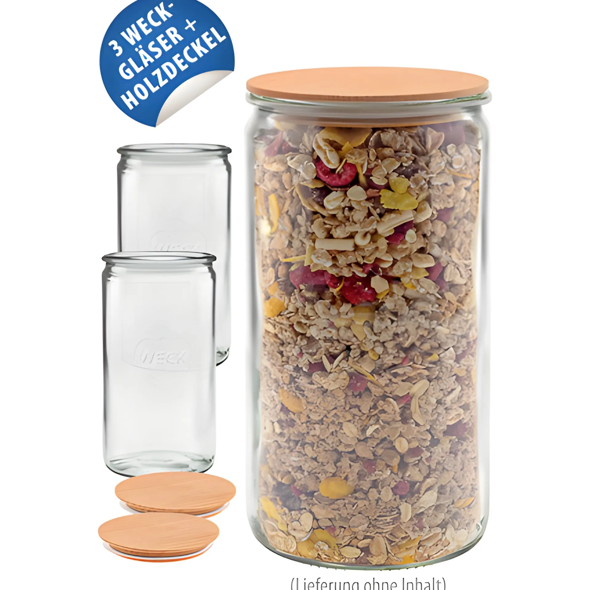 Informationen zum Artikel: WECK-Zylinderglas 1590 ml mit Holzdeckel, 3er Set