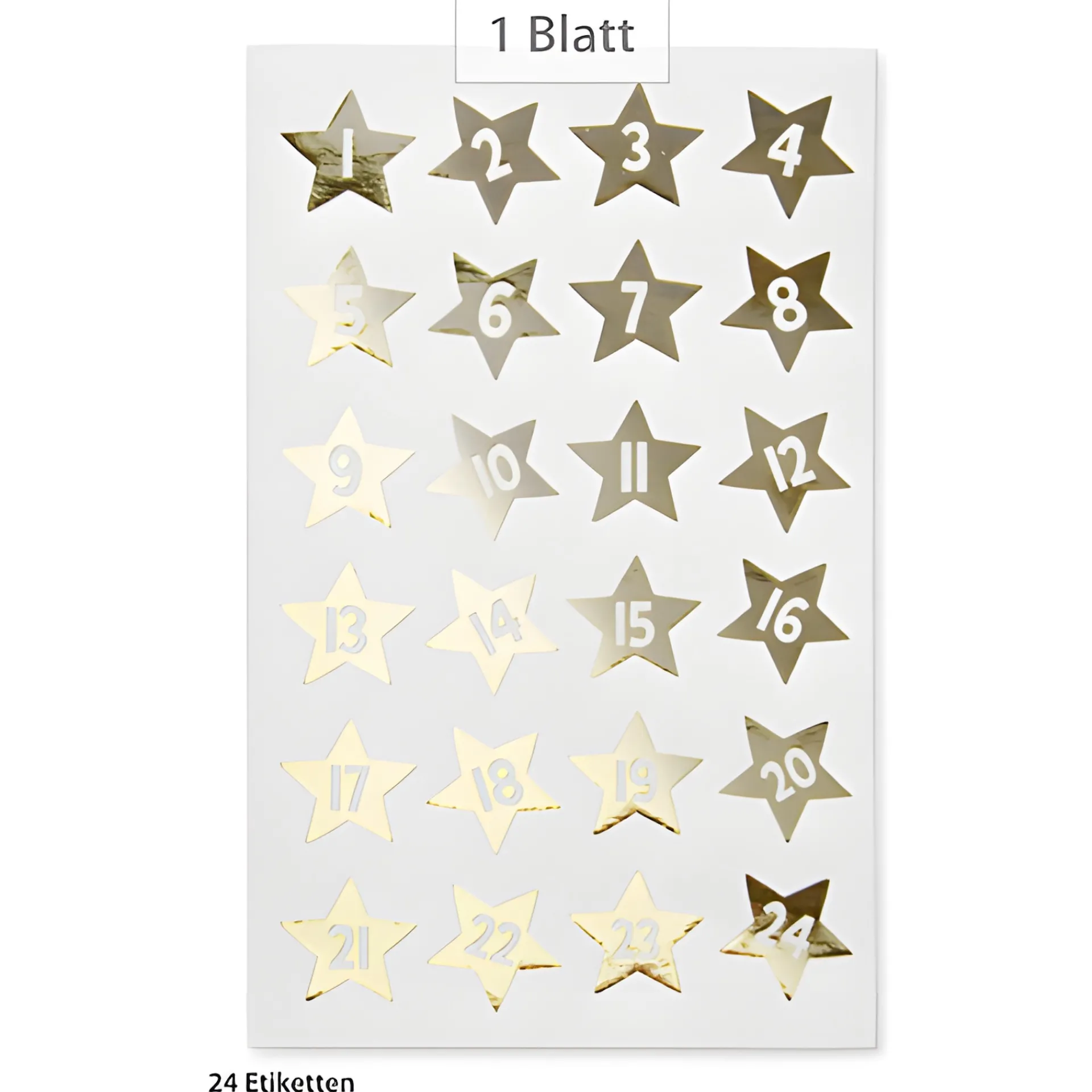 Selbstklebende weiße Adventskalenderzahlen in goldene Sterne – Zahlen von 1 bis 24, die wunderbar als Adventskalenderbeschriftung verwendet werden können.