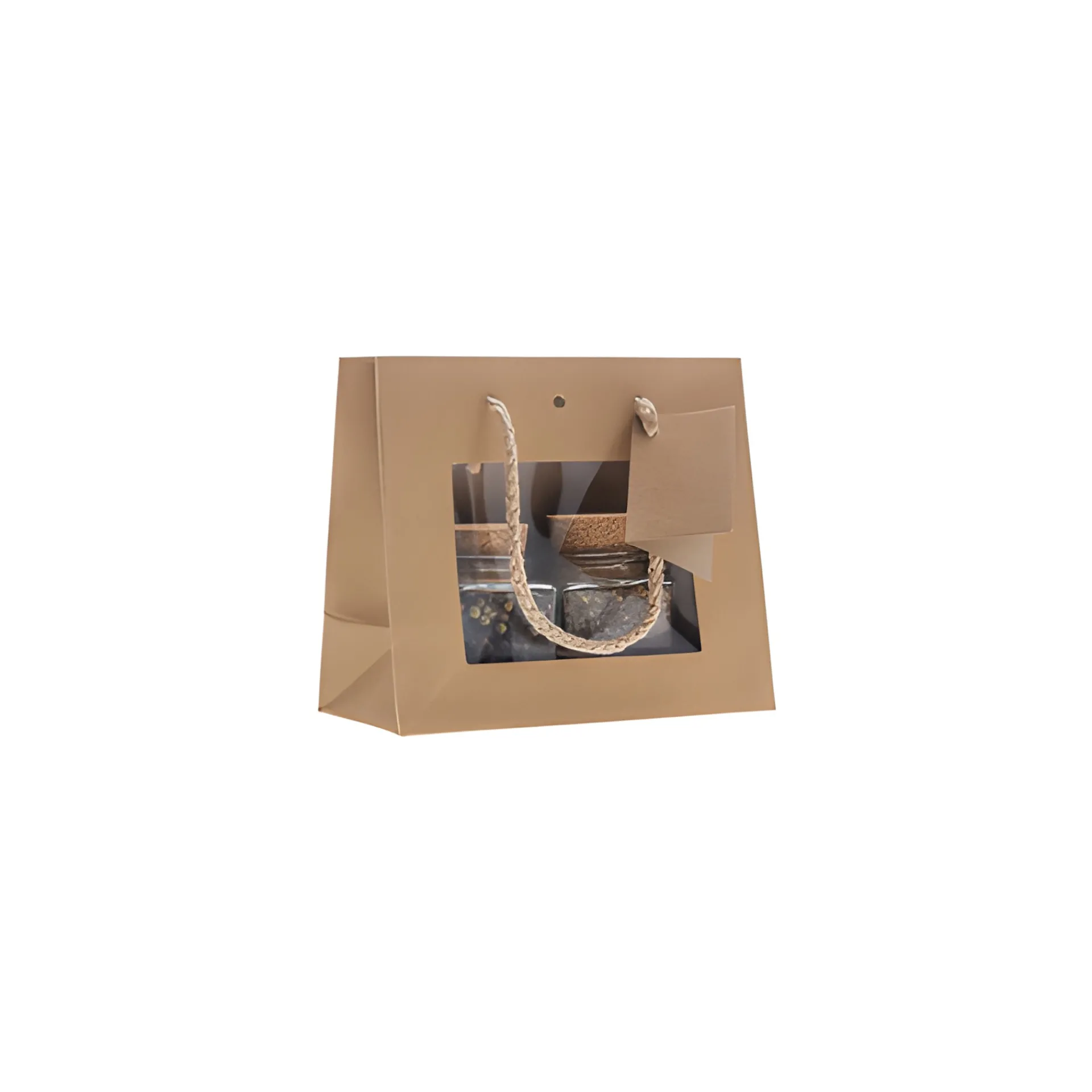 Diese kleine Tragetasche aus Kraftpapier hat auf der Vorderseite ein Sichtfenster, so kann man schon vorher einen Blick auf das Geschenk werfen. Die Papiertüte verfügt über zwei weiche Tragekordeln von denen bei einer auch ein Kärtchen zum Beschriften anhängt.