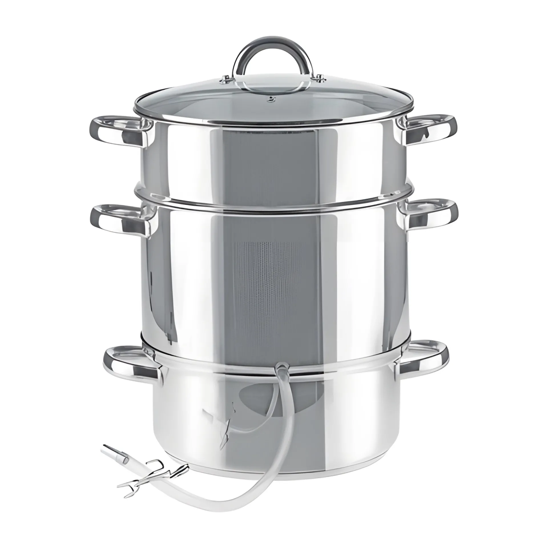 Hochwertiger Dampfentsafter von ELO aus poliertem, rostfreiem Edelstahl, mit dem sich Gemüse und Obst schonend entsaften lassen.