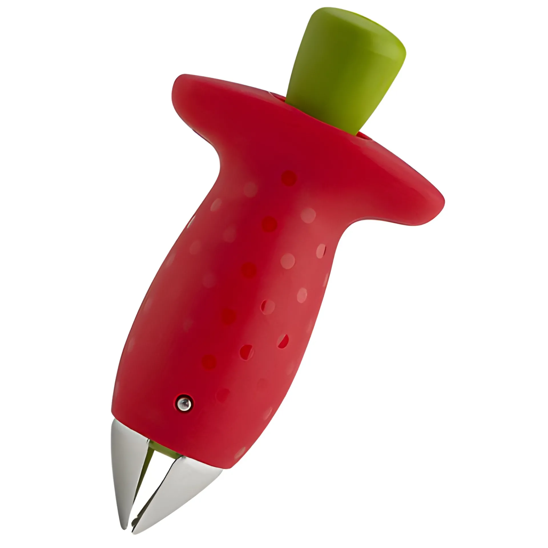 Mit dem CHEF’N Erdbeerstrunk-Entferner lassen sich im Handumdrehen die Stiele samt Grün von den Erdbeeren entfernen. Dazu die geöffnete Spitze um das Grün hinein stecken, den Knopf loslassen, um 180 Grad drehen und anschließend herausziehen.