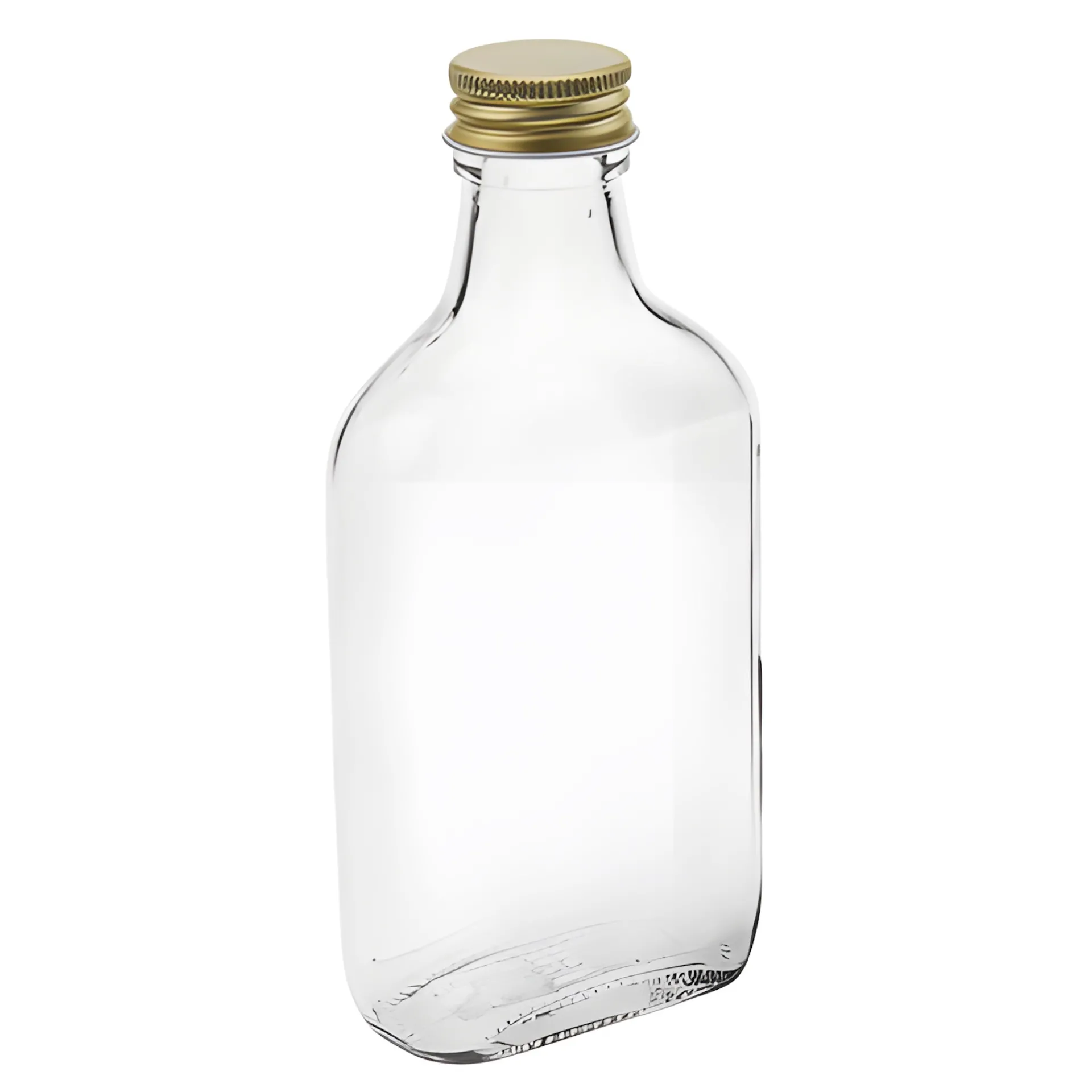 Die schlichte Flasche aus klarem, stabilem Glas hat eine flache Form und erinnert an einen klassischen Flachmann, den man sich unauffällig in die Tasche steckt. Sie hat eine Mündung für einen praktischen Schraubverschluss und kann auslaufsicher transportiert werden. Ideal zum Mitnehmen wärmender Spirituosen bei winterlichen Wanderungen oder zum Picknick.