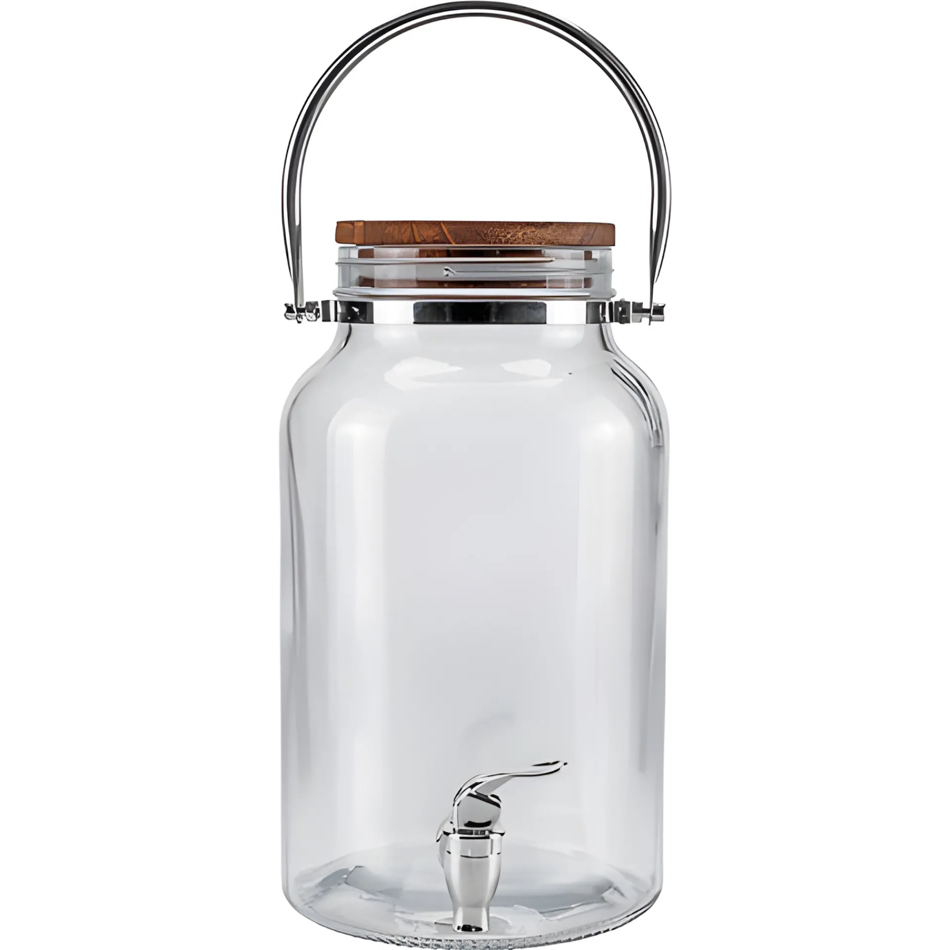 Getränkespender mit schönem Holzverschluss und Henkel für Ihre Feier. Mit einem Füllvolumen von 5,55 Litern passt in diesen Limonadenspender genug hinein, um eine durstige Partygesellschaft zu versorgen. Die Öffnung wird mit einem dunklen Holzdeckel mit Silikondichtung verschlossen und mit dem silbernen Metallhenkel kann der Dispenser überall dahin gestellt werden, wo er gebraucht wird. Der silberne Zapfhahn aus Kunststoff macht das Abfüllen von Saft, Limo, Eistee, Longdrinks und Bowle kinderleicht. Ein Muss für die nächste Sommerparty!