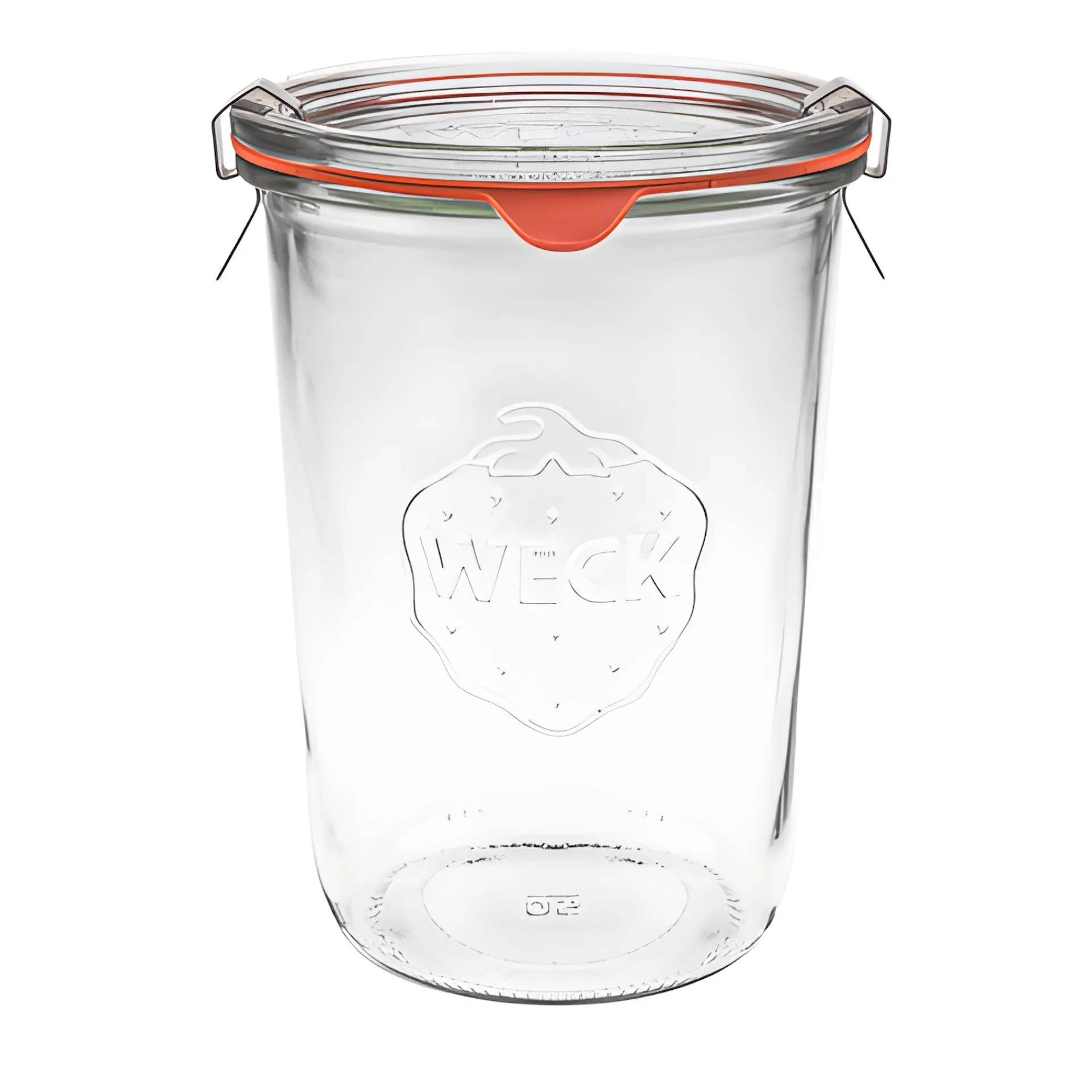 Das hohe Sturzglas mit einer RR 100-Mündung und einem Volumen von 850 ml hat alle Vorteile eines soliden WECK-Glases: Kuchen backen, Pastete haltbar machen, Brot einkochen, Kompott und Gemüse einwecken, all das ist mit diesem Einmachglas möglich. Die konische Form ermöglicht das Stürzen von Backwaren und eingekochter Wurst, und dank der großen Öffnung mit Rundrand eignet sich das formschöne Glas auch sehr gut zum Transportieren und Servieren von Schichtsalat, Suppe oder Eintopf.