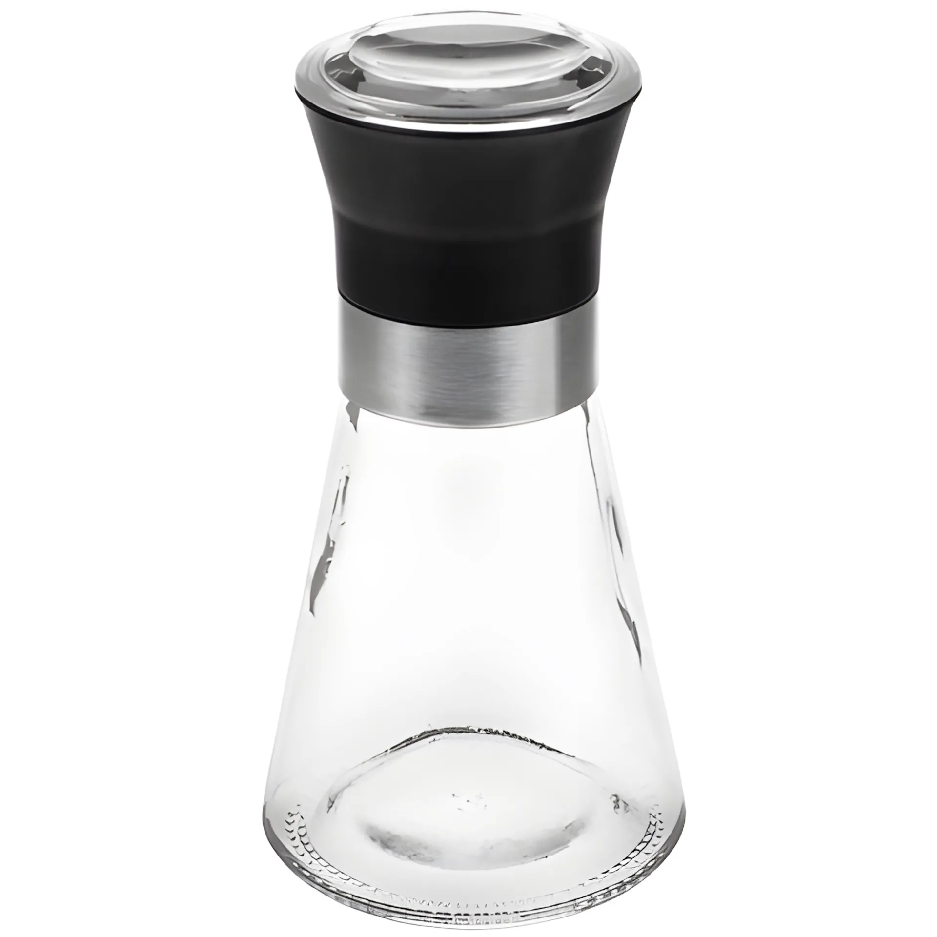 Diese Pfeffermühle besteht aus einem Glasbehälter mit Schraubgewinde und einem Kunststoffmahlwerk, das Salz, Pfefferkörner und andere harte Gewürze mühelos zerkleinert. Details aus mattschwarzem Kunststoff und gebürstetem Edelstahl machen die Gewürzmühle zu einem schönen Hingucker auf Tisch und Tafel.