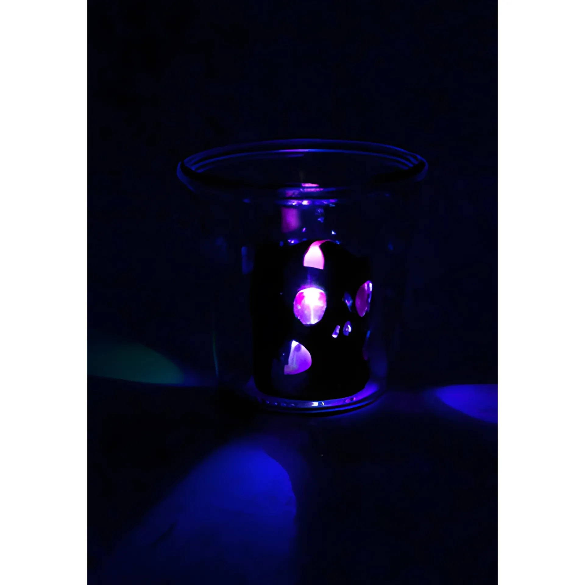Originelle Totenkopf-LED-Kerze für Ihre Halloween-Deko. Sie ist aus leichtem Kunststoff und sorgt für eine schön schaurige Atmosphäre. Das bunte LED-Licht der schwarzen flammenlosen Kerze wechselt automatisch seine Farbe.