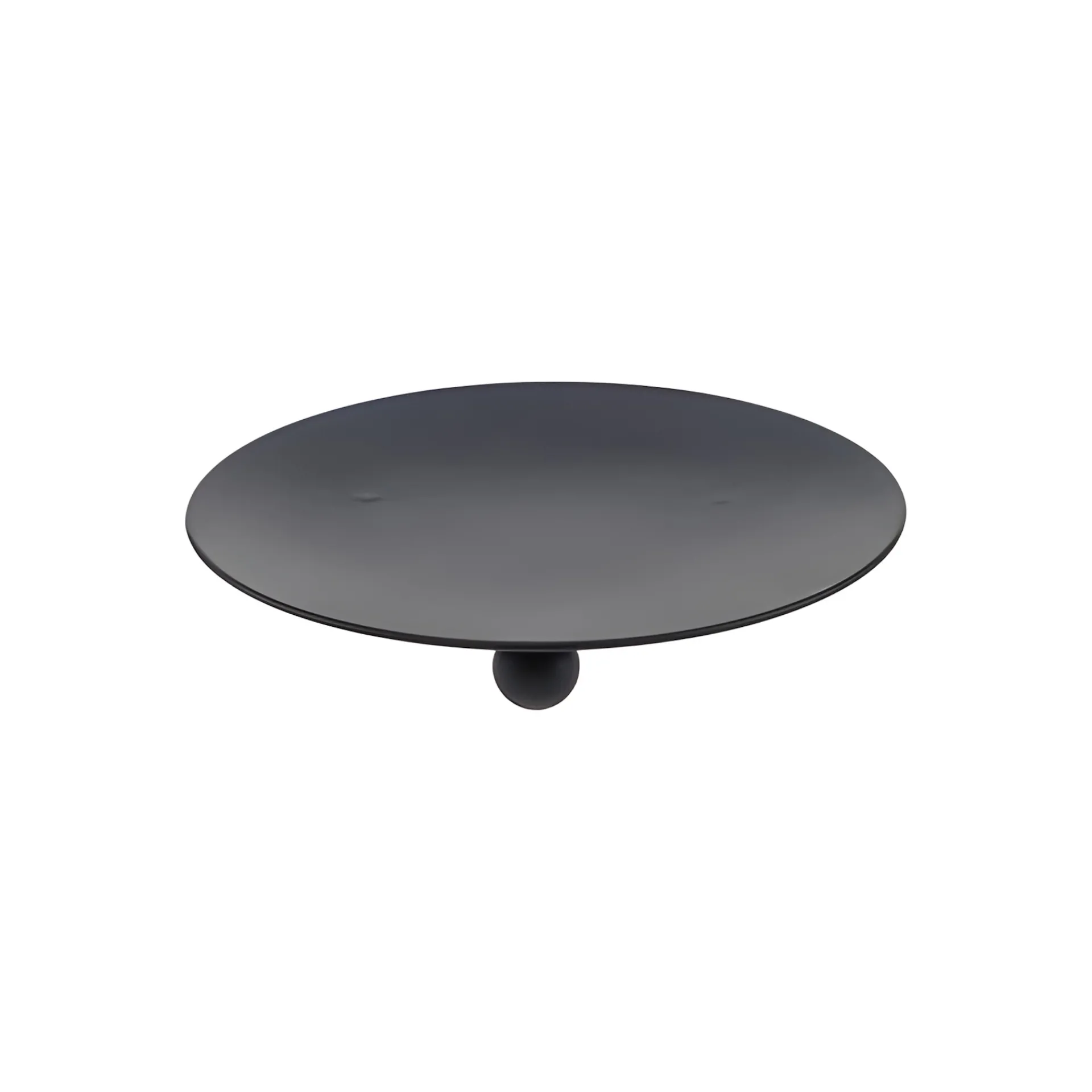 Der schwarze Metallteller steht auf drei niedrigen Füßen und hat eine leicht gewölbte, runde Fläche von 12 cm für eine Stumpenkerze. Auch runde Gläser mit einer Kerze, Teelichter und Windlichter können darauf effektvoll platziert werden. Das matte Schwarz des Tellers bildet einen schönen Kontrast zur Transparenz der Gläser und lässt sie wirkungsvoll zur Geltung kommen.