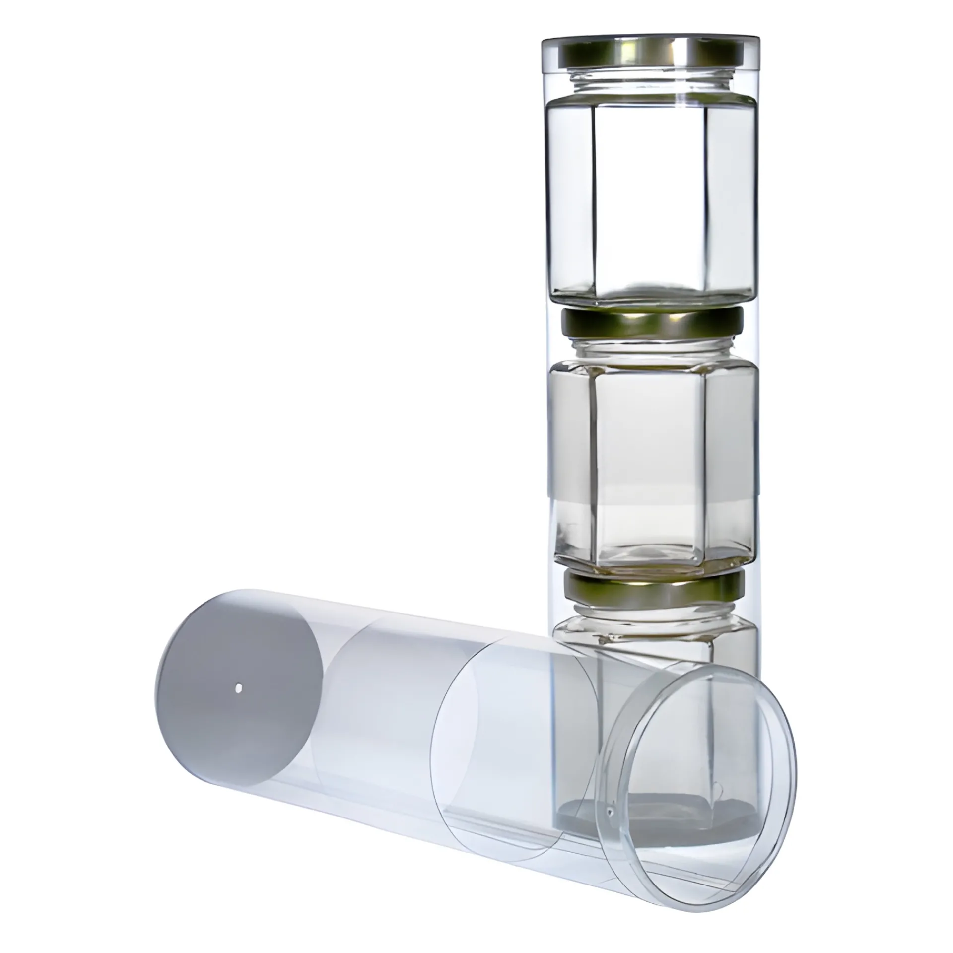 Ob nun für ein Glas oder gleich für vier Gläser, die Höhen der möglichen Gläser sind unterschiedlich, deshalb ist die höhenverstellbare Klarsichtdose eine gute Wahl zum Verpacken. Die Verpackungshülse wird auf die Höhe der gestapelten Gläser zusammen geschoben und für einen guten Halt mit einem Klebestreifen fixiert.
