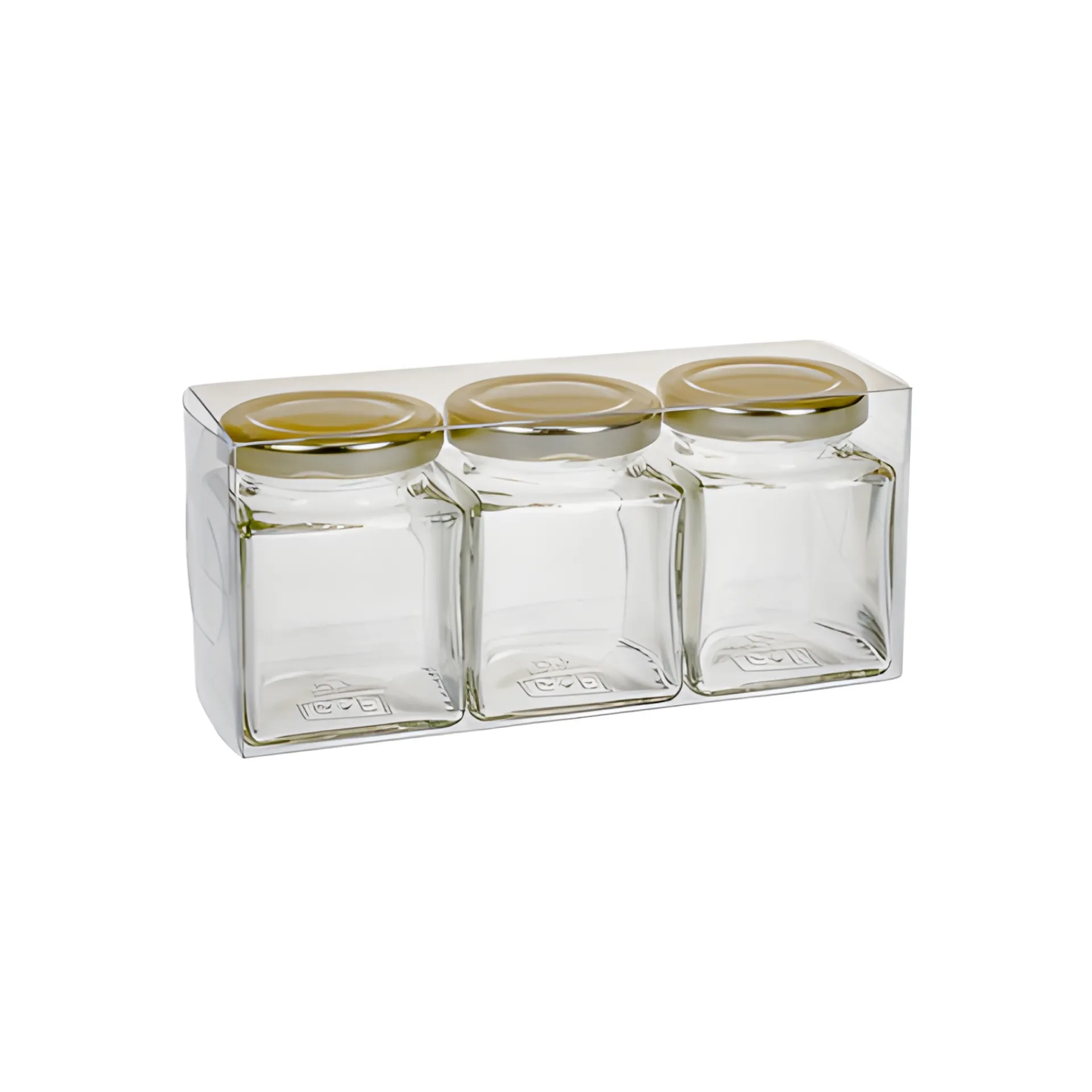 Die hochwertige, transparente Klarsichtschachtel ist eine schöne Geschenkverpackung für 3 Einmachgläser, z. B. 3 x Quadratglas 111 ml G+F, die dekorativ nebeneinandergestellt werden können.