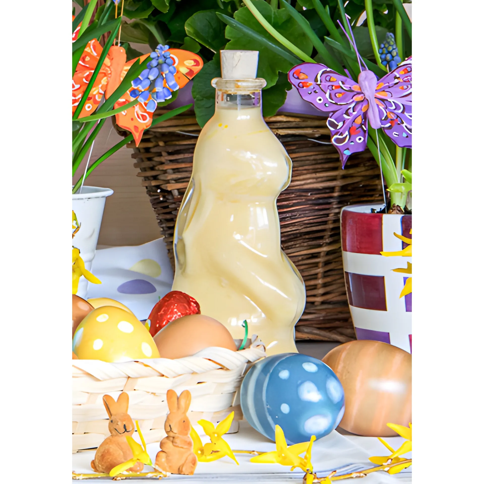 Die originelle Schmuckflasche in Hasenform sollte nicht nur zu Ostern zum Einsatz kommen, denn sie kann das ganze Jahr über Freude bereiten. Die hübsche Flasche mit Korkmündung kann klassisch mit Eierlikör befüllt werden, eignet sich aber auch sehr gut für Sirup, Likör, Spirituosen oder auch Schokoladensoße.