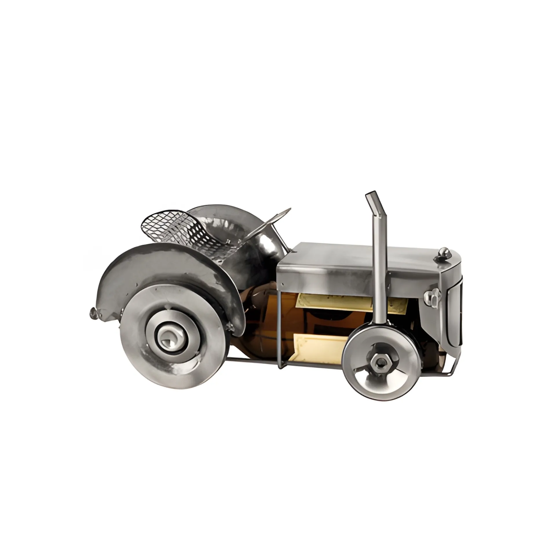 Origineller Flaschenhalter aus Metall: Im Korpus dieses Traktors lässt sich bestens eine Flasche verbergen.