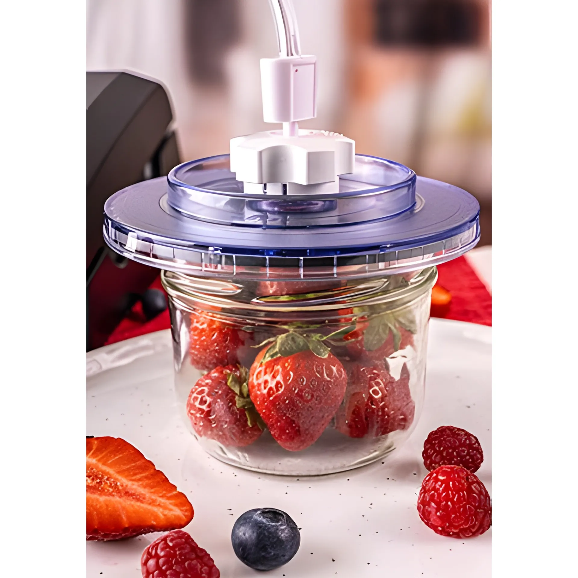 Der Deckel hat ein Ventil zum Öffnen, Vakuumieren und Verschließen, in welches der Ventilschlauch gesteckt wird, der mit einem Vakuumiergerät verbunden ist, um die Luft aus dem Glas herauszupumpen. Hat man kein solches Gerät, kann man auch eine Handpumpe verwenden und auf das Ventil setzen. In dem gefüllten Glas entsteht so ein Unterdruck, durch den die Lebensmittel im Glas vakuumverschlossen sind und länger frischgehalten werden.