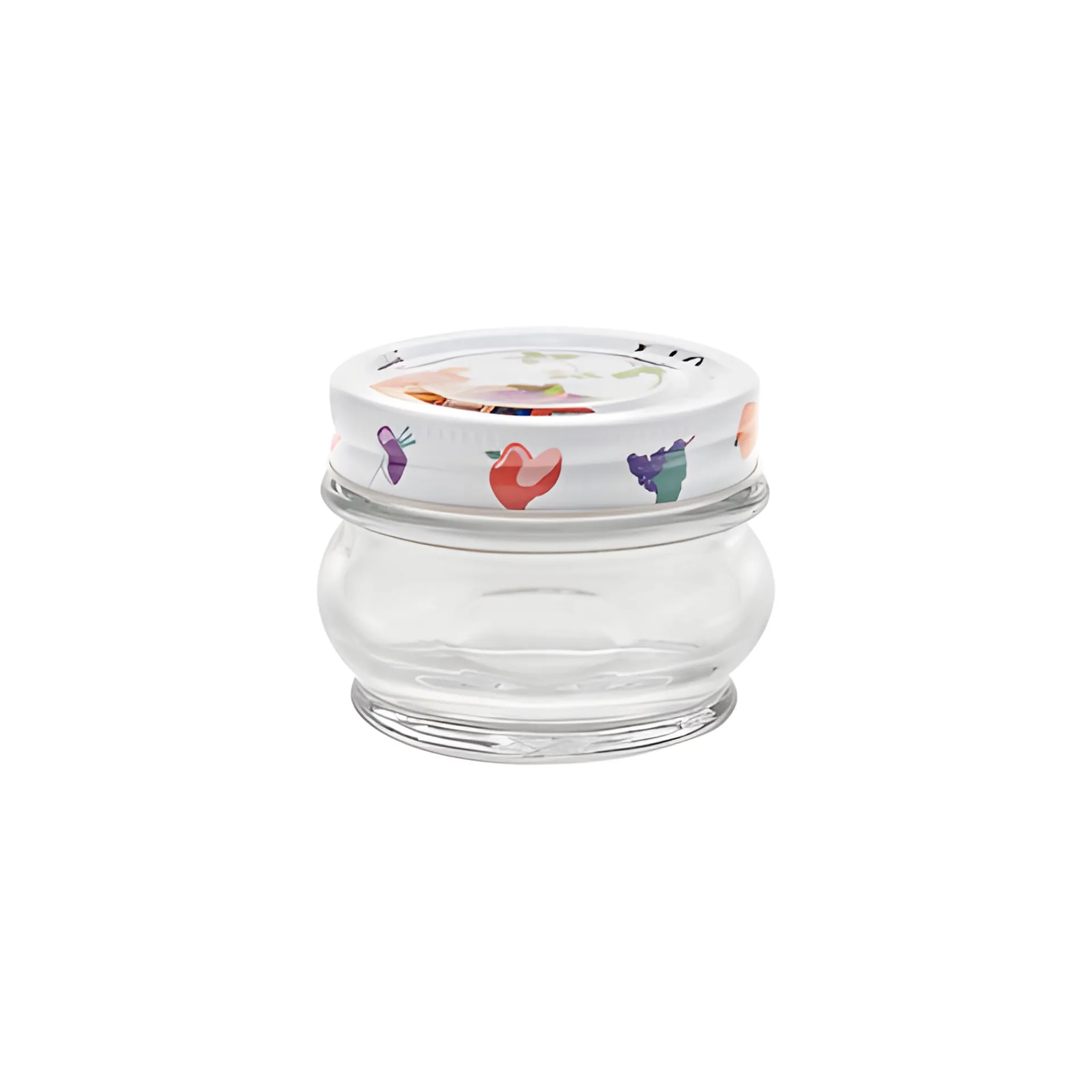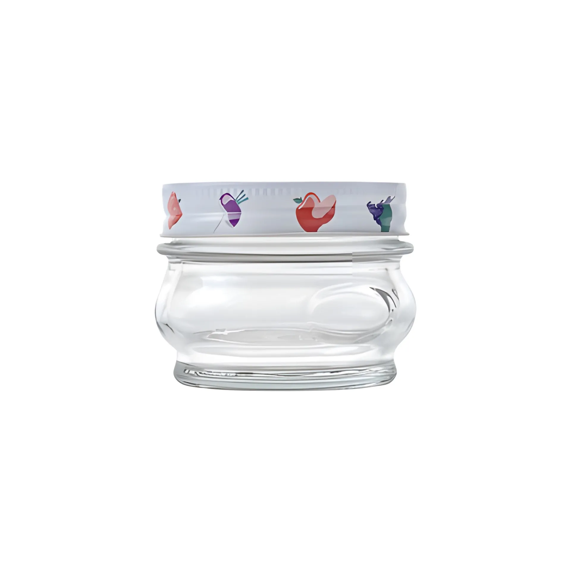 Italienisches Einmachglas in hübscher, runder Form. Das bauchige Glas hat eine kleine Etikettenfläche und begeistert mit seiner schönen Qualität. Der Verschluss ist mit buntem Obst und Gemüse bedruckt, perfekt also für fruchtiges Gelee, Konfitüren und Chutney.