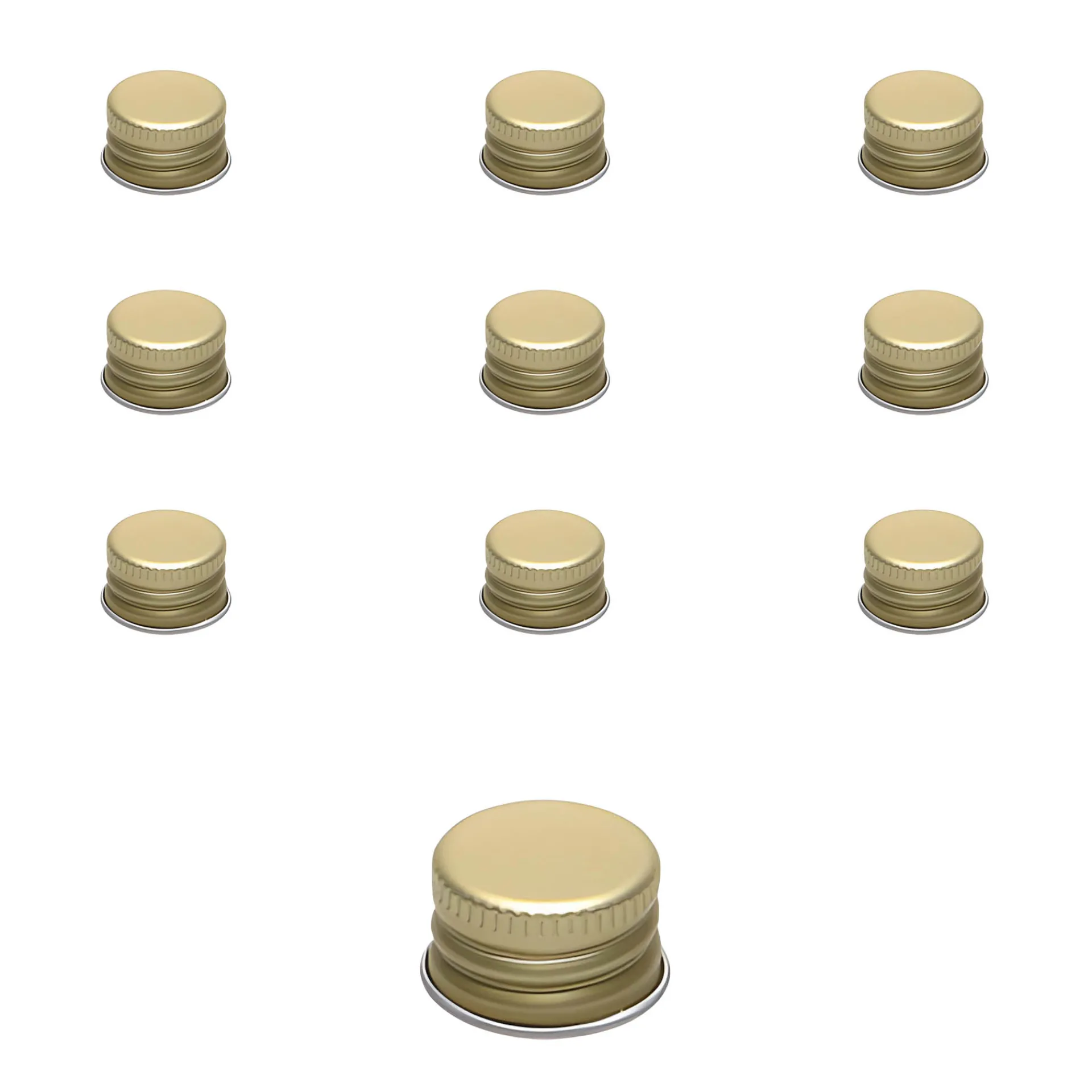 Der goldfarbene Schraubverschluss aus Aluminium mit Rollrand im praktischen 10er-Pack passt auf alle Schraubflaschen mit einer PP 18-Mündung, z. B. auf kleine Probierflaschen wie die Kropfhalsflasche 40 ml, die Taschenflasche 20 ml oder die Geradhalsflasche 50 ml.